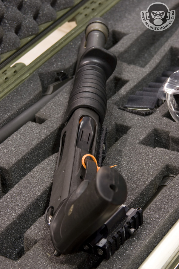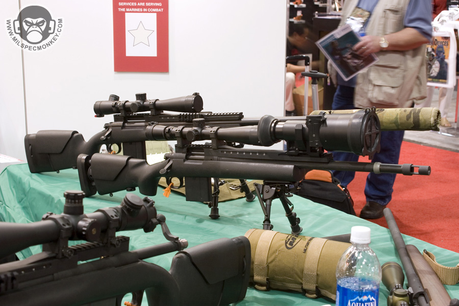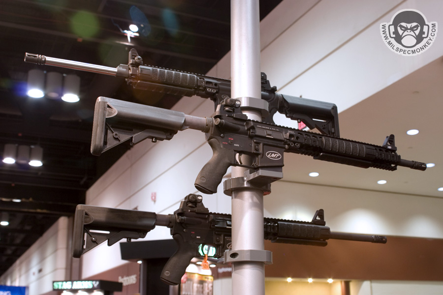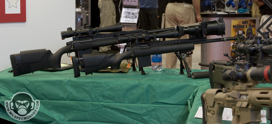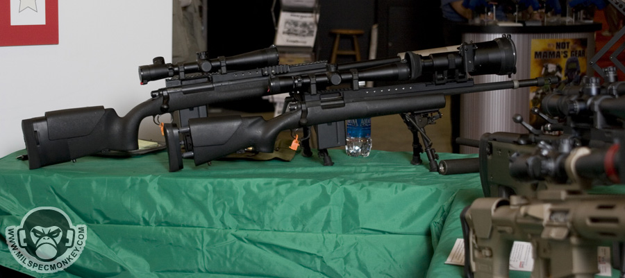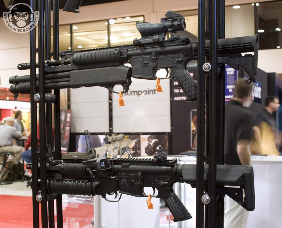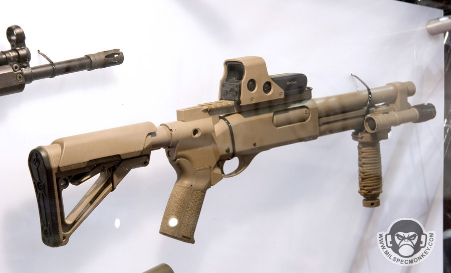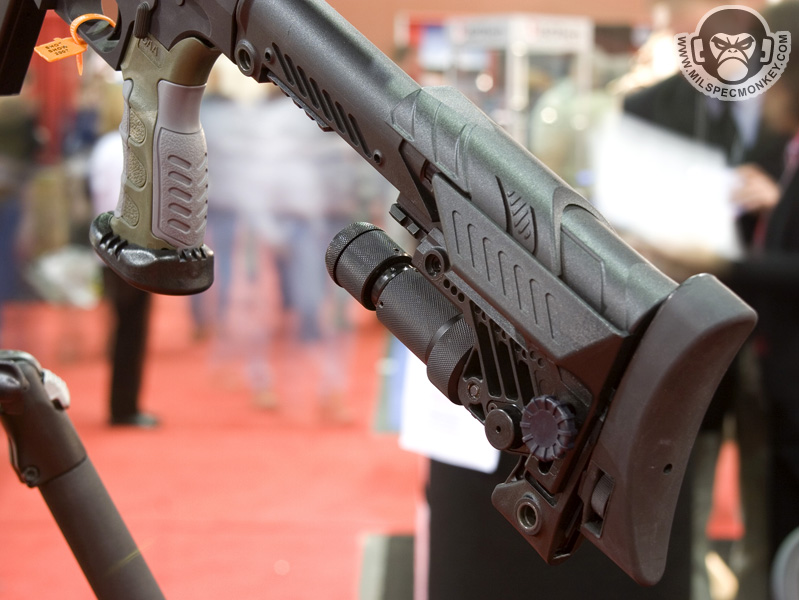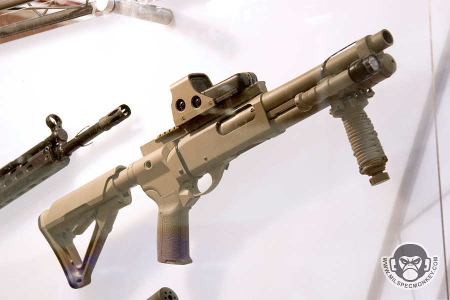 They had a tough looking set of their sniper rifles on display, but my favorite has to be the 870 MCS (Modular Combat Shotgun). The full kit allows one to go from classic stocked shotgun to shorty breaching weapon and then even to a M4 "master key". Stocks and barrels are able to be changed quickly and with no tools.
