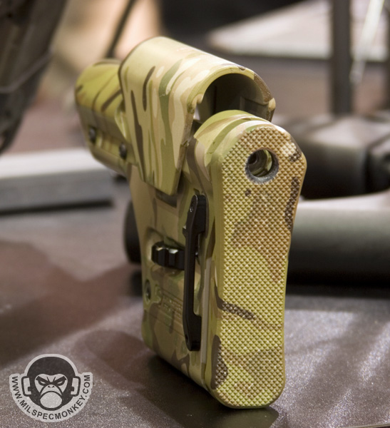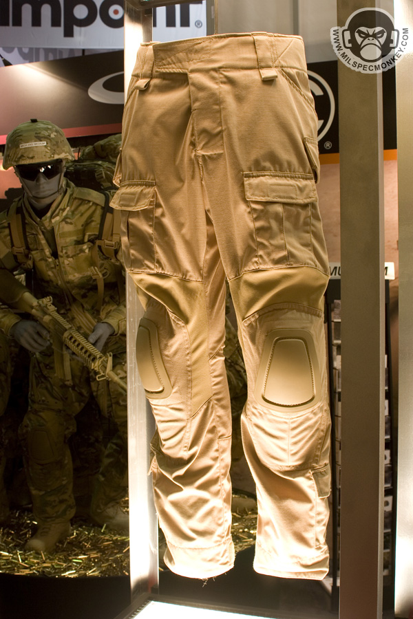 Crye had some interesting updates to their already innovative products. The new combat pants and shirt have been slimmed down for weight, but kept their main features such as integrated pads. The pants had some interesting stretch panels I had not seen before and shirt will now be made with Drifire for the main torso area which is great wicking / anti-flame material. I couldn't take pictures, but the revised Crye plate carrier was on display. They toned down all the hardware, so it looks more like a current plate carrier, however is still has most of the previous features. The stock locks are gone, and the plates are inserted by more traditional means. Also shown were a couple of items for examples of Multicam water transfer printing. Enough of my blabbn' check out the video demo: