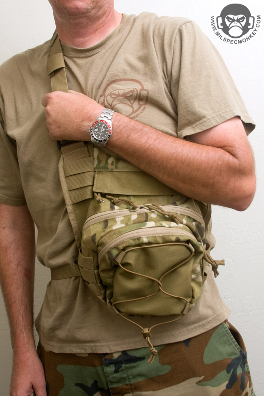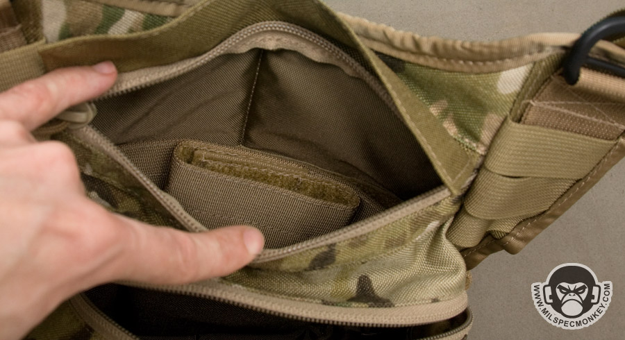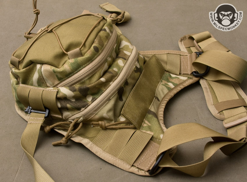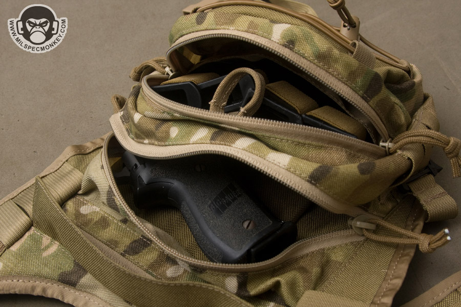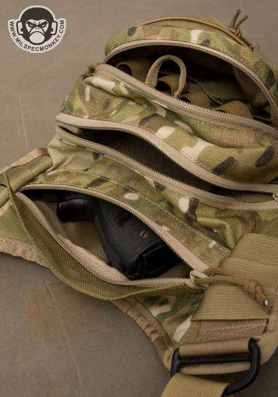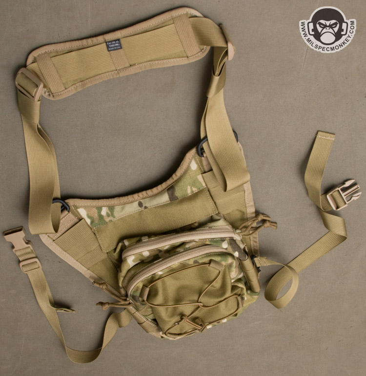 Looks like TT was feeling crafty and decided to take a stab at making their own CCW shoulder bag. My first impressions of the Crossfire are that it is lightweight and most of the holding space seems to be depth rather than the other dimensions. The adjustable shoulder strap comes with a pad that is a nice mix of non-slip and breathable mesh. On the back of the whole pack is a large dose of mesh with padding to help with comfort and airflow. As with most meshes of this style, keep hook velcro away from it as it will tear its ass on up! For extra mounting options there is PALS webbing on the upper ends of the platform and on the sides of the compartments. They aren't huge so only expect to attach pouches that fit 1 PALS channel x 2 rows. Making good use of the side PALS, Duraflex Slick clips are used to attach a removable waist strap to assist in securing. Hence the removable aspect, you can just take these off if you don't ever see yourself using them.