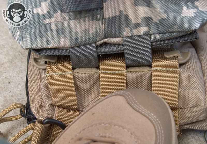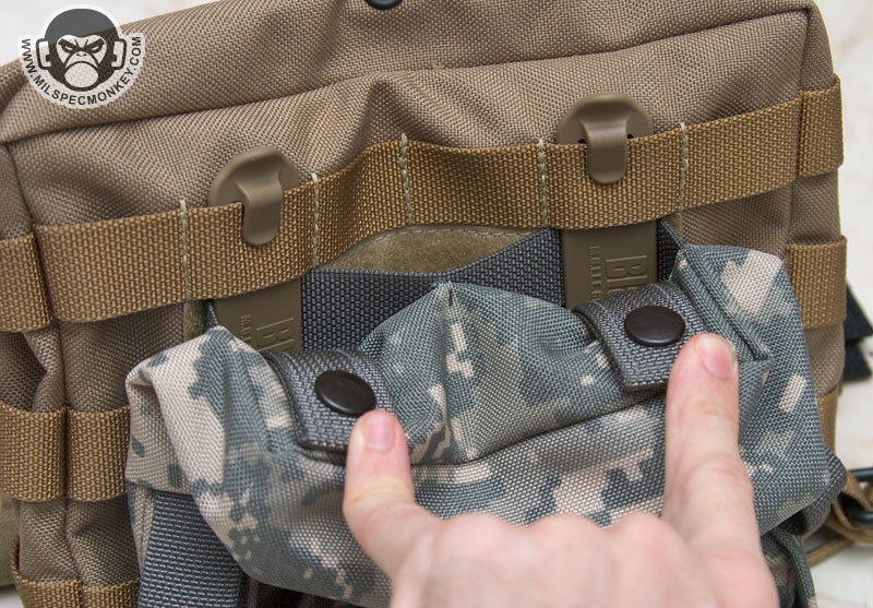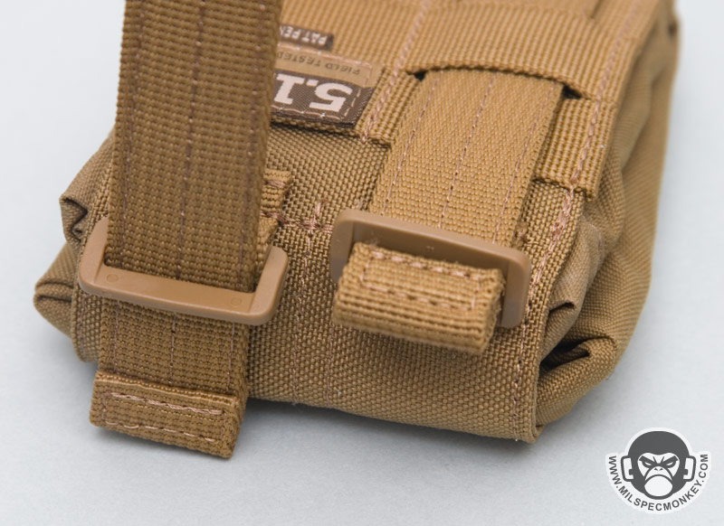 BFG took the velcro secured idea and enhanced the security level. The webbing layout starts similar to a traditional MOLLE Snap, yet at the bottom has a webbing strip that is hook on the interior and loop on the exterior rather than snaps. Once woven, the loop covered webbing tab is tucked under for decent constant pressure. For an important addition, folds are incorporated into the webbing straps to snag if the velcro seal is broken.