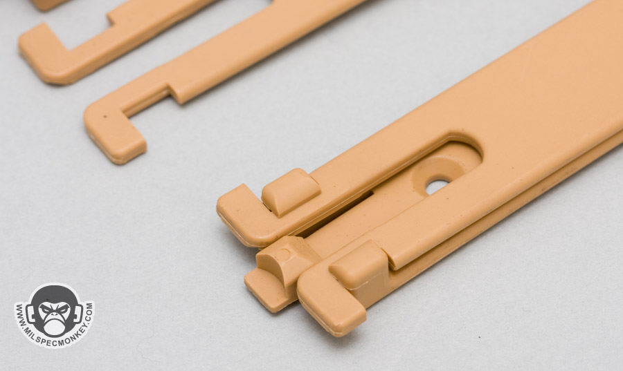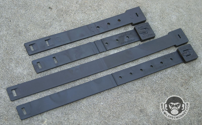 Ol' Blade-Tech took a pretty heavy duty approach and made these MOLLE LOKs. They are pretty darn rigid so I'm not sure if they ever intended the user to weave them. Due to this, the screw holes can be used for solid mounting points. As a bonus, the screws are even included. The end locks up pretty nice and secure. To release, it requires the middle area to be pushed down and the sides to be pushed in to clear the side hooks. This gives Malice clip like security without requiring some form of poker tool. I'm curious about how the middle hinge will stand up over time, but overall the MOLLE-LOKs are heavy duty and can take quite the beating. They are available in 2 sizes which are the equivalent of Malice short and long. Offered in Black, Foliage, and Tan colors. The main down sides are that since so stiff, they are really hard to weave and are the most expensive option out there currently.