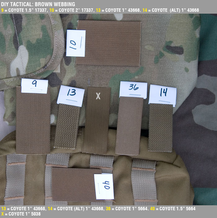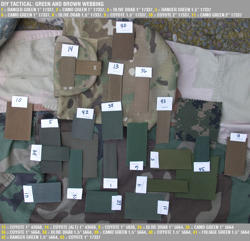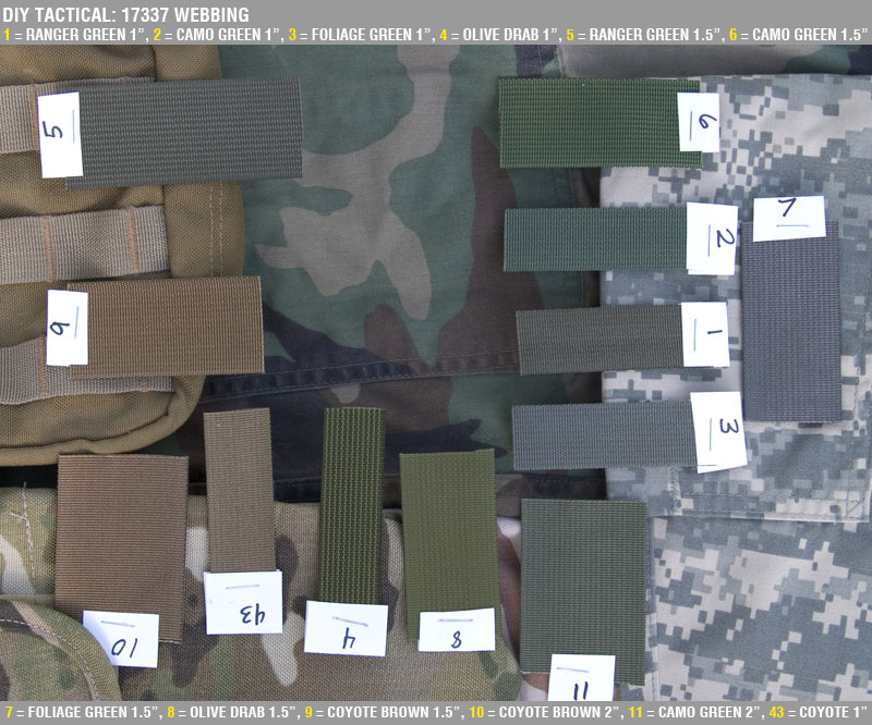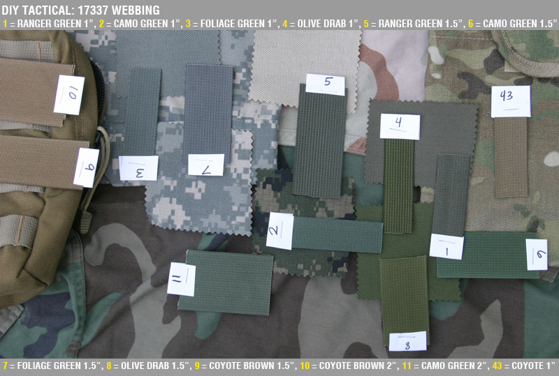 DIY Tactical webbing examples: They even carry the hard to find Ranger Green. Great place for small/medium webbing orders. <www.diytacticalstore.com>