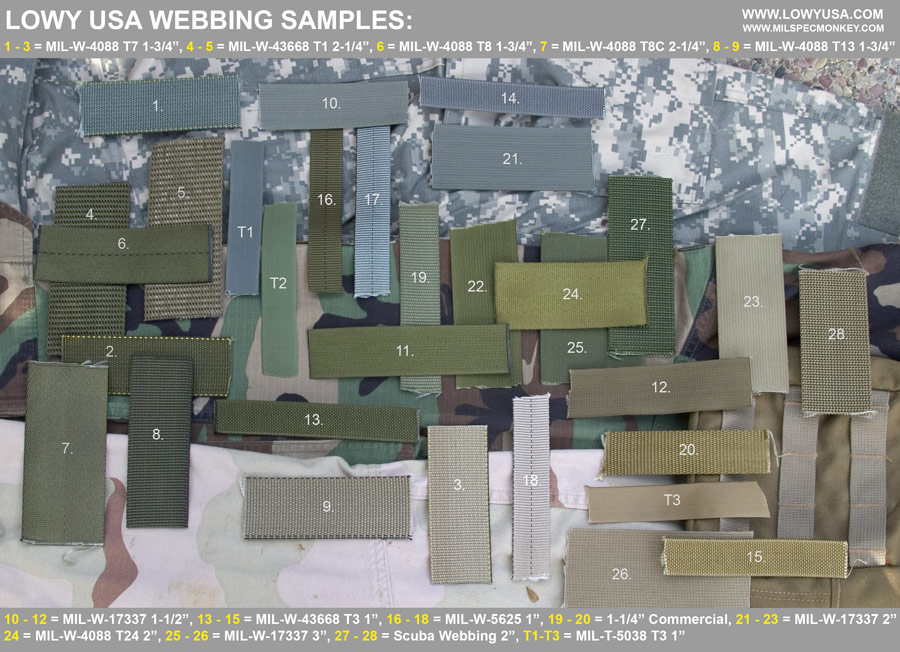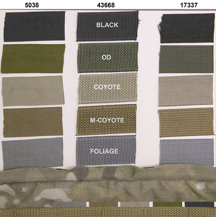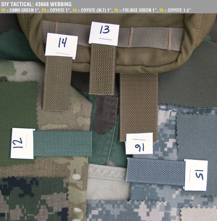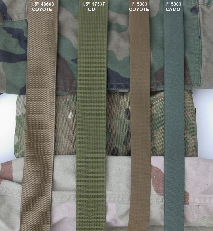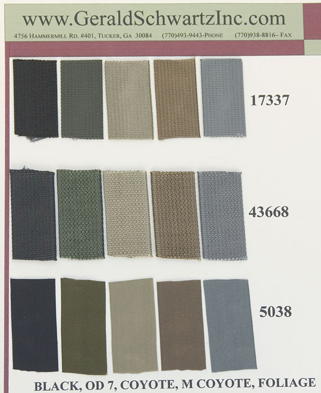 Lowy USA has a great webbing type and color selection including some of the harder to find webbings such as scuba and seatbelt types. The Coyote 43668 1" was a bit saturated/golden, but overall good stuff.