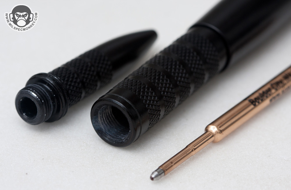 The core features stayed the same so I'm gonna copy a paste a bit: The clip is still made of heavy duty spring steel with rowdy chemically welded bolts. In summary I won't be worried about that breaking off anytime soon if ever. Functionality wise it has good tension and the raised end lip makes it easy to mount. The cartridge is the same ones used in those cool guy space pens so they are pressurized allowing the user to write upside down and in extreme temperatures. They are affordably replaceable whenever you do run out of ink. The exterior finish is pretty snazzy and so far has been very scratch resistant. Although the finish isn't super flat matte, it is non-reflective and won't take on fingerprints. A lanyard hole is in the cap to allow your favorite cord to be added if a connection point is desired. As with all the Tuff-Writer pens so far, the kind of user they attract are those who like things super simple and heavy duty. As a self defense tool it may not be a knife, but a poke anywhere with this thing will get a bad guy's attention. For those trained for it, the Operator pen is long enough for hand and arm trapping techniques. The tip isn't made to be a specialty glass breaking device, yet it will get the job done all the same when it comes to busting windows.