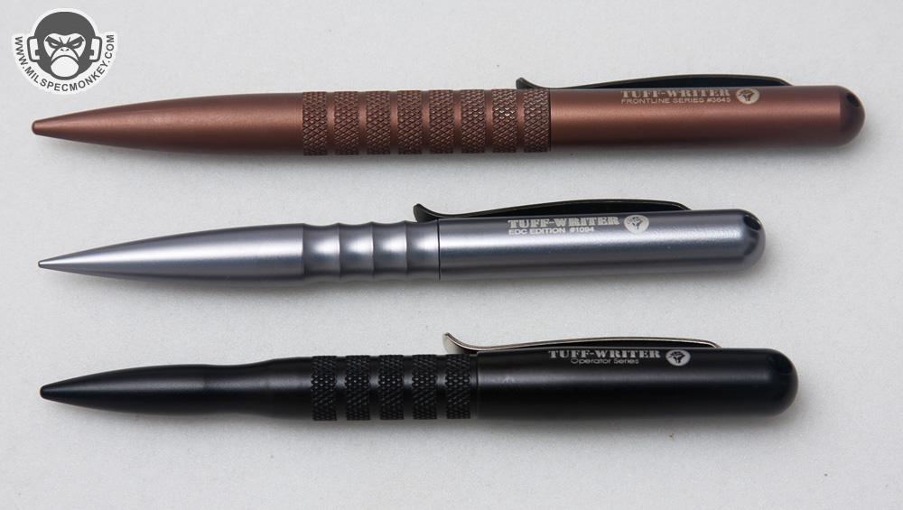 Tuff Writer has been keeping busy and offers yet another variant of their tactical pen design. It looks pretty similar at first, but I think they did some really great changes on this operator series to make it shine. It is closer to the EDC size, only being slightly longer and has a point more like the original Frontline series which is less sharp than the EDC variant. I dig the size as it short enough to allow for easier holding options whether it be a pocket or notebook while still being long enough to be a plausible self defense tool.