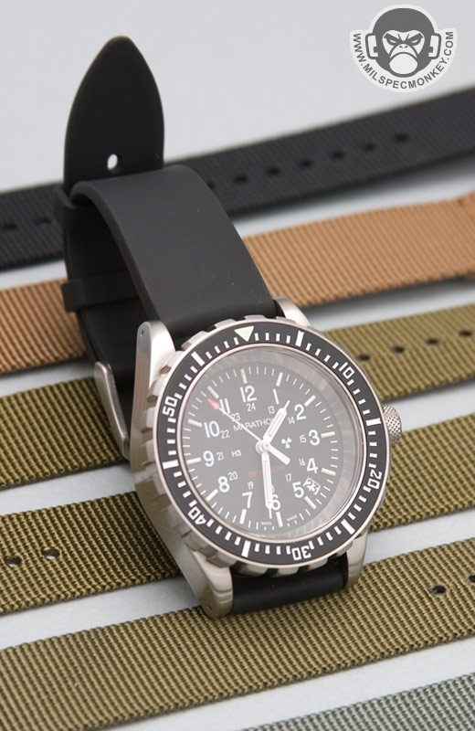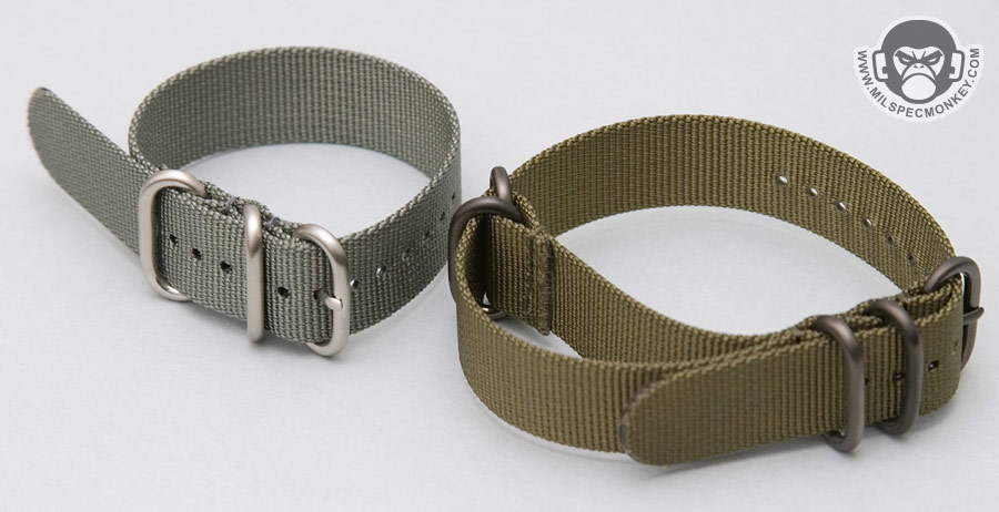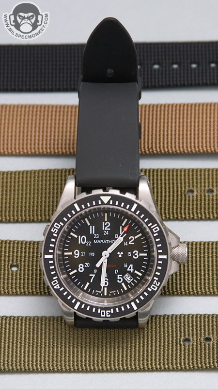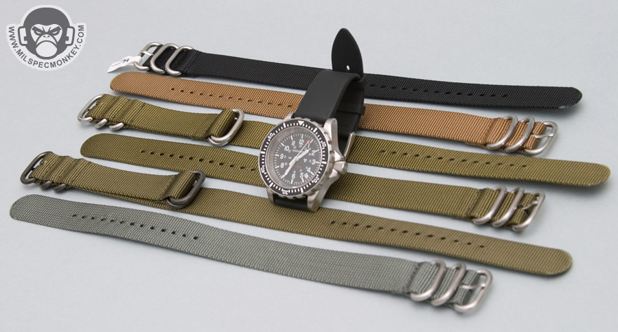 These are used on the hour markers and also on the hour and minute hands. Although mostly green, the 12 o'clock mark is orange. MaraGlo is used on the second hand in red and the 0-arrow of the bezel in light blue which reacts to light charging. A black natural rubber strap comes standard with the watch and feels much nicer than your typical cheapo syntetic watch band. If you want to class it up a notch, a stainless steel band is available. Also shown here are the Zulu bands which are great for the TSAR or many other watches. Bands are available in 20mm, 22mm, and 24mm widths in two buckle or four buckle configurations. Furthermore a vast mil color selection is available including hi-viz orange. The webbing used for the main part of the strap is a great compromise of comfort and durability. With laser burned holes this band is built to last putting most synthetic bands to shame. The buckles are made from brushed high grade 316L Stainless Steel that will not cause any negative magnetic effects to any of your gear.