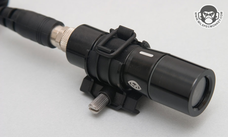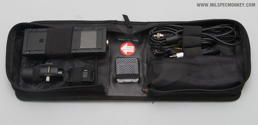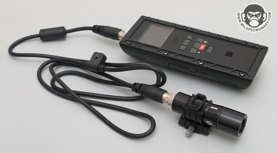 When you first get it out of the box you notice it comes with a nice fold up case and inside is a crapload of stuff. As I said earlier, this thing comes Deluxe, you don't have to worry about buying a bunch of extra crap just to be able to use it. All the core stuff is there: recorder, wires, controller, small mem card, but in addition there is a vast collection of mounting accessories. The main mount piece to attach to the camera is a C-Clamp that will let you rotate the camera to your needs and it can interface with the included picatinny style tube rail mount and wide flange base mount. It was a little confusing at first, but a small rubber O-ring is included that goes on the C-Clap to help make sure the camera rotation stays in place. The tube mount is good for handle bars/rails while the flat mount is good for mounting using screws, zipties, velcro, or whatever else you come up with. Don't forget the C-Clamp is picatinny rail mount ready on its own so can easily go on weapon rails. I don't have them yet, but OPS-CORE is making helmet rail packages for MICH helmets that work awesome for the POV.1 system. Until I get one of those, I plan on velcro-ing up my wide flange base with hook velcro to attach to the loop velcro on my MICH.