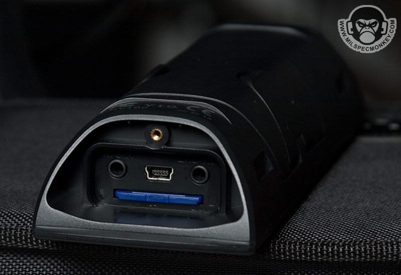 When getting started for the first time, the wire is side specific so you have to make sure the correct side goes into the camera and recorder. There is an eye icon on the camera end to give you a hint, but since it is black on black it is a bit subtle. It would be nice if the wire only connected correctly, but perhaps that would cause other problems. If you do put the wire on backwards, the recorder will act like no camera is attached and tell you so. A cool thing about the wire is that a MIC is fully integrated. You don't have to worry about placement or power of the MIC like you do on other helmet camera solutions. The POV uses SD-cards for memory which isn't quite as cool as CF cards, but still work fine and are affordable. Memory is easily inserted into the bottom of the recorder and a 1 gig card is included. Also in this bottom area is a input hole for a separate microphone, USB port, and an A/V out hole. If you plan on getting wet, the whole bottom has a water tight cover to make the recorder rated for being 1 meter deep in water. Since this cover suction seals itself, it can be hard to take off so I recommend attaching cord to the screw ring. As a side note I wish the supplied A/V out cable came with a L-type connection since the straight version supplied protrudes a bit from the recorder. When in a pouch it puts more stress on the A/V out hole and cable. Moving to the back is the battery compartment. 2 plastic flaps hold the water-tight cover in place. Although the flaps are easy enough to open, there isn't any easy way to grab on to the actual cover so one ends up usually prying it out with their fingernails. I wish this was easier, but I understand the design dilemma to be water tight and not have extensions sticking out from the recorder. Inside is the good stuff in which the recorder uses simple 4 AA batteries. I am quite happy with this decision since AAs are easy as hell to get a hold of in normal and rechargeable form. The battery life is about 4 hours on rechargeable batteries if recording the whole time and lifetime increases if idling instead of recording.
