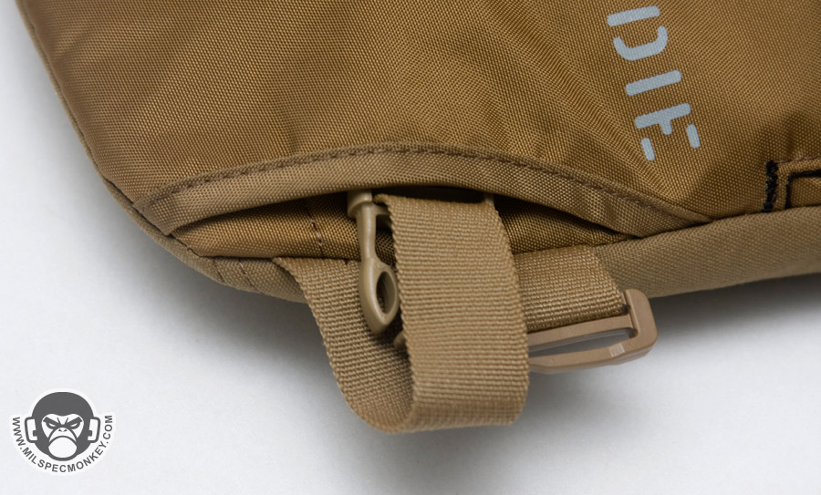 The OMEGA Water Beast 102oz Reservoir is included and fits in a crafty manner allowing the majority of the bladder to be covered, but the main opening is accessable under the flap. An adjustable webbing loop is even up top to secure the bladder on. The Big Bite valve and Hydrolink valve cover are fortunately included in the package. Most users will route the main tube through the upper left or right shoulder ports, however the lower sides of the carrier have additional port holes for more options. There is even a zipper down the side for quick internal access whether it be to adjust the bladder or toss in some scoobie snacks.