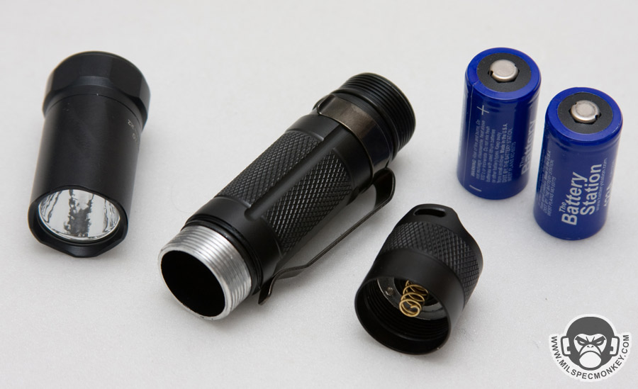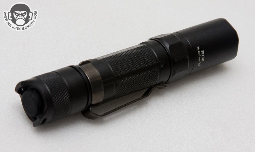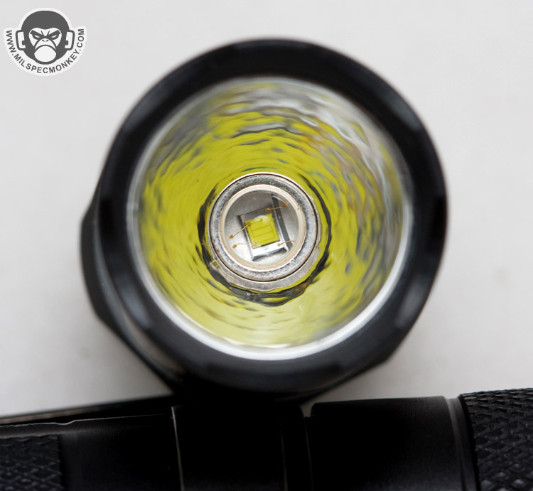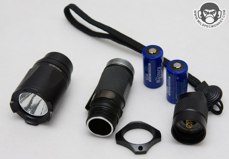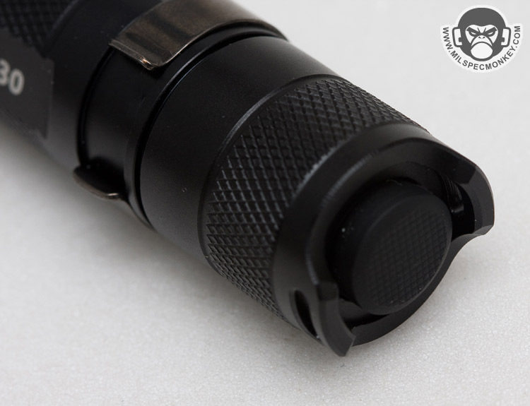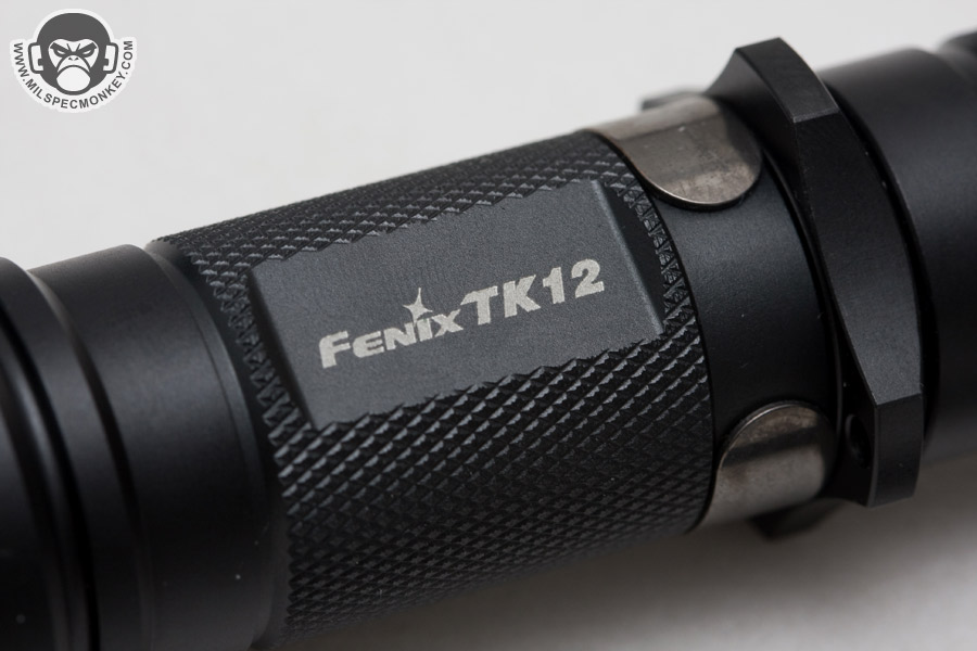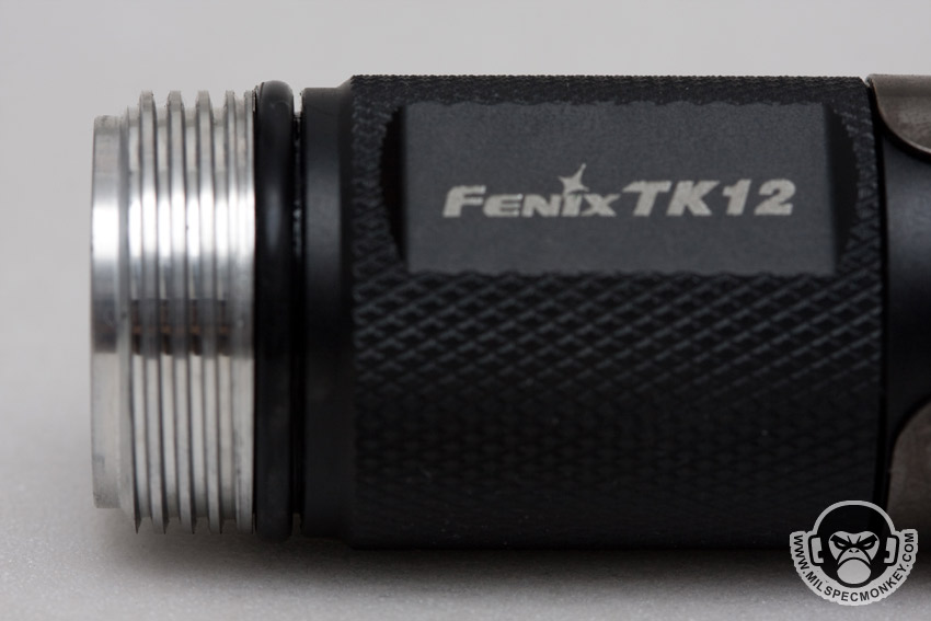 The TK12 is quite the different beast and appears to be optimized for tactical preferences. The belt clip is standard and like on the PD30 variant, it can be removed. The design is based on using 2 CR123 batteries, however 18650 rechargeable batteries can be used by getting an affordable battery tube accessory or buying the TK12EX package. The bezel has much more aggressive extrusions and although not especially sharp, they are plenty enough to settle a man down with a wack on the head. An anti-roll ring is included which double functions allowing a cigar style grip. For those who find this piece to just be in their way, it is removable. A bonus hole is in this ring for a secondary lanyard attachment point. The button area has extrusions that are notched and come just under the button. This allows for a easy button press while still having some accidental discharge protection. Since the button extrudes out a little, the TK12 cannot stand on its tailcap without external support. Due to this button setup the light can be difficult to engage in the cigar style grip as the button doesn't stick out openly like on Surefire lights.