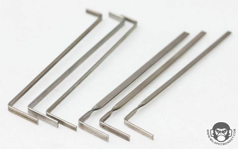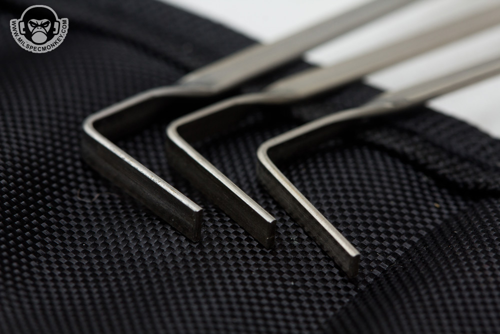 The tension wrenches mostly vary by sizing, but 3 are twisted for comfort while the other 3 are double sided to offer more length options. The varied width is crucial for varied keyhole sizes and then having additional short tension ends comes in handy when dealing in small locks. How far the tension bar is inserted and which one is used can adjust the tension feel to assist the operator's needs.