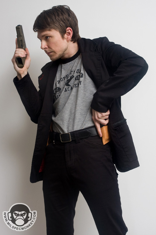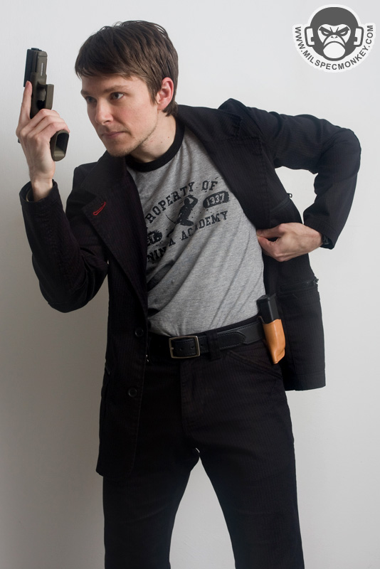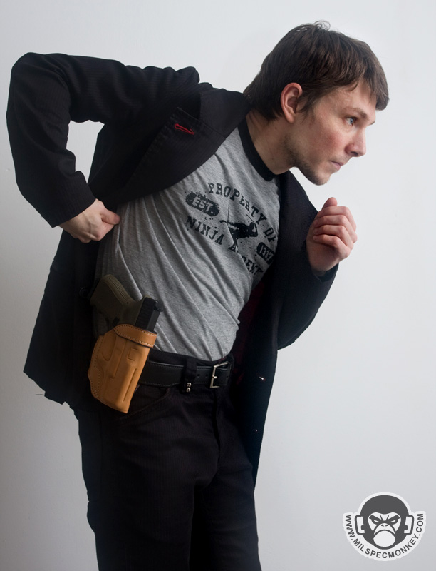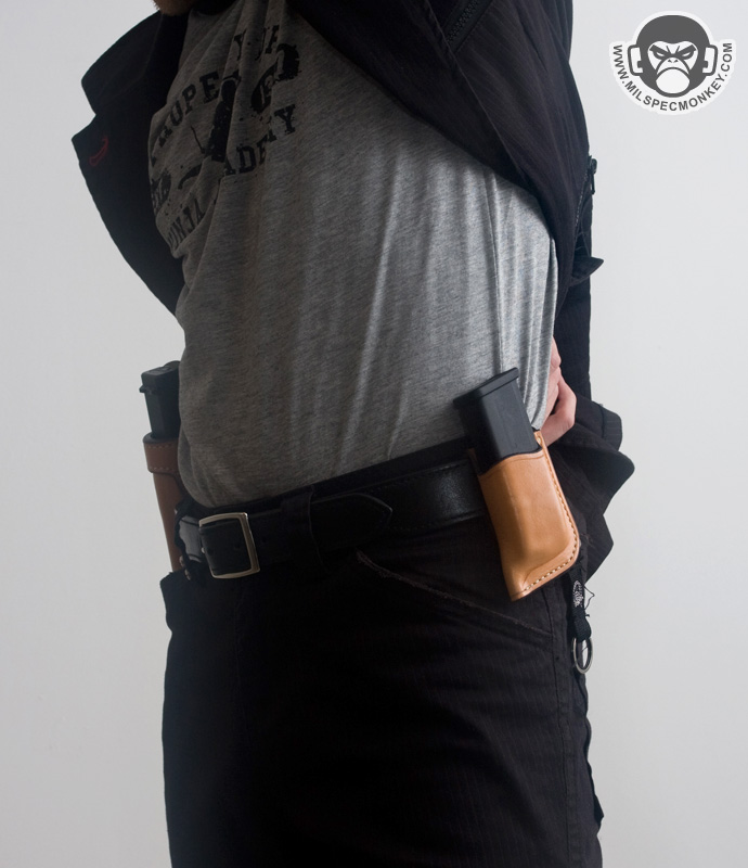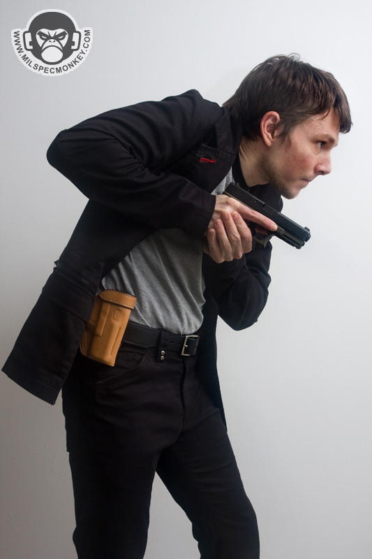 So why bother with leather some may ask? I'd say the main factor is comfort. The kydex and fancy polymer holsters work great for combat operations, but tend to not be something you want stabbing on your side all day long. The properties of good leather are that it is rigid enough to hold your kit, but flexible enough to be friendly on your body. Some may miss the fancy releases and angle positioning control of the non-leather holsters, but I was pleased with the balance of concealability and accessibility of the simple straight down position of the Rafter-L holster. I actually like my angle slightly back, so when I go for my pistol I can create the desired angle by leaning forward. This all works out great as an aggressive forward stance is a part of my shooting stance. It would be fair to call Rafter-L goods expensive, which leads to the classic phrase of you get what you pay for. The extra cost goes into the details lost on mass production leather such as: proper sizing to your weapon, quality control on each production step, and using the highest quality materials. All these come together to offer long term durability not seen in cheapo versions. If a detail is slacked, then the leather will stretch out highly degrading performance. Rafter-L currently offers goods in classic Black or a Natural Tan which will cover most needs. As a note the tan will be lighter than the medium browns many are used to seeing on other holsters. I have attached some pics and a quick video to show an example of operating all 3 items together. Hopefully it is apparent that despite being an old school inspired design, it does not mean it is slow or less capable. The only thing slowing me down is the clothing to cover it all up. When open weapon display is not an issue, I would use something else for a military style zombie stomping rig, but for concealed carry I'm highly digging this Rafter-L package.