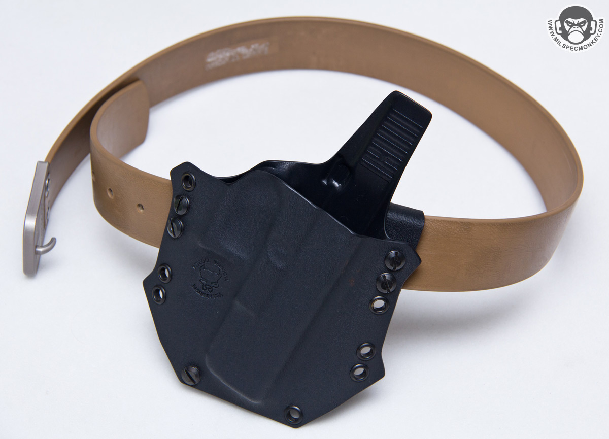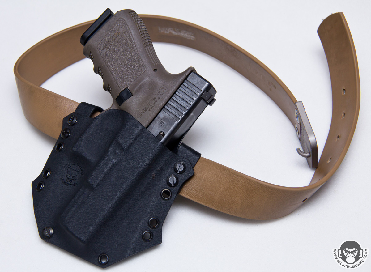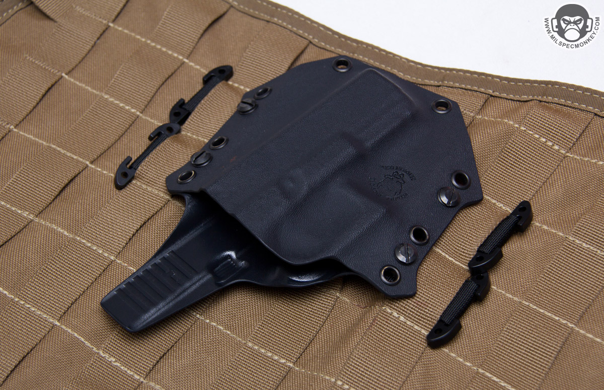 Small details count on kydex so it is nice to see all edges are properly smoothed out and good hardware is used. The screws interface with simple flat head screwdrivers so no wacky specialty tools are needed and coins will work in a pinch. O-rings are also included to add screw tension preventing unscrewing with normal wear and use. An extra screw set is even included which is a welcomed addition for creative mounting and backup hardware. I inquired what was the deal with the "spikes" on the sides and Pitbull Tactical confirmed they were for adding strength to stress points and a dash of visual sass. I was a bit worried they may create body poke points so luckily they haven't been a problem yet and I do agree they add some aggressive flair to the holster look. Thickness wise .06" kydex is used for the main construction which offers good flexibility comfort while the clips use .93" to reinforce the mounting points. These thicknesses match up well together since the holster is made up of 2 pieces while the clips are single piece based giving a consistent strength to the holster as a whole. The end result width is nice and compact with the bloodline series being one of the smaller footprint kydex holsters out there; making sure not to get carried away with getting bulky and overbuilt in a bad way.