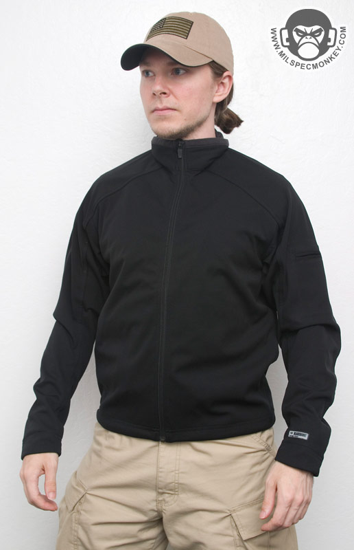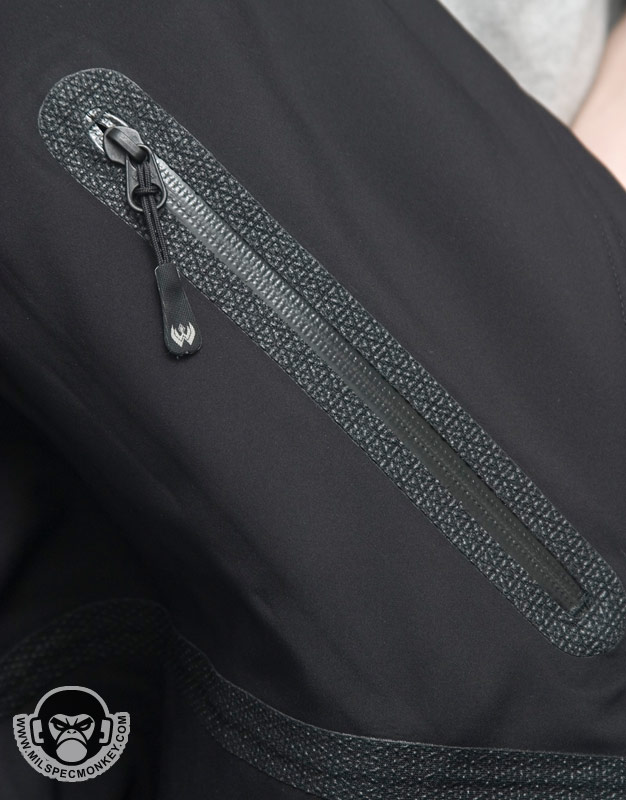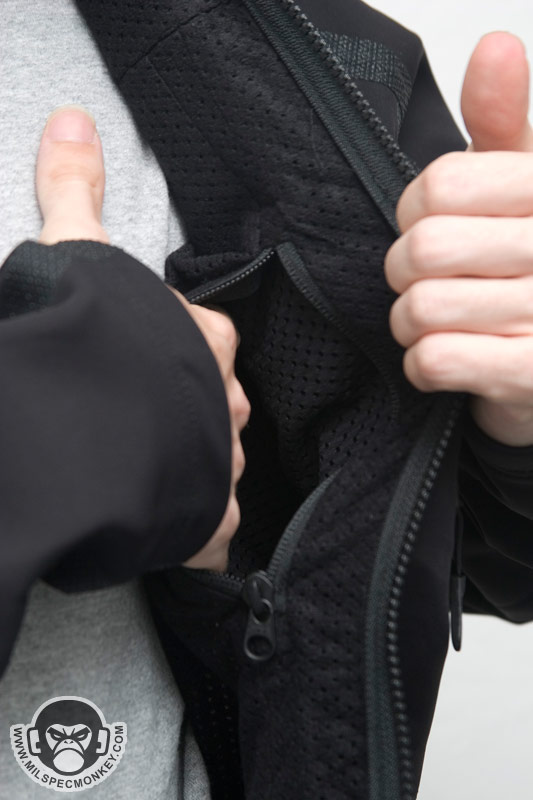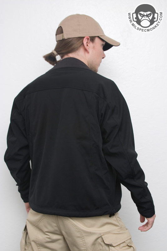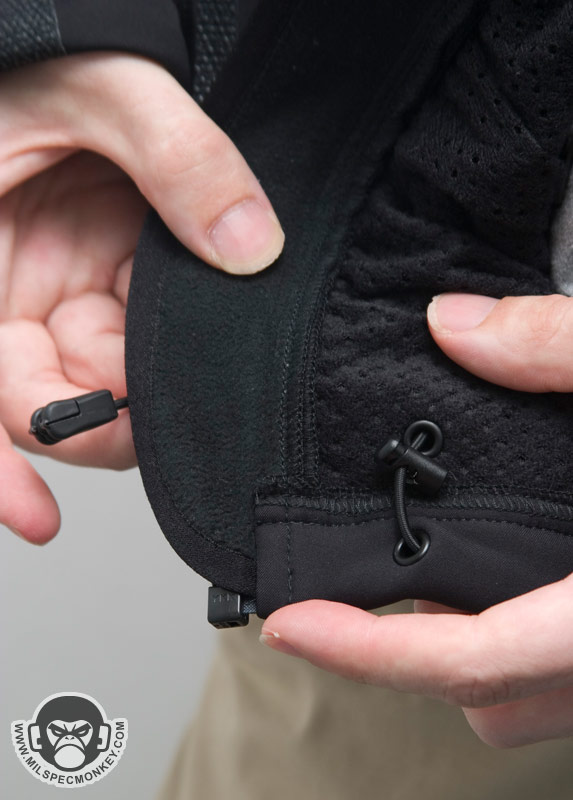 The meat of the jacket system is layer 2, The Ops Jacket. The sizing and thickness is what most expect out of a medium jacket, but it has additional element protection and features. I'm not sure what the main shell material is, but Blackhawk calls it a Durable water-resistant (DWR) soft-shell. All of the outer seams have been sealed by being covered with textured non-slip material and a large batch has been added to the elbows for added durability. The interior is made up of a combination of fleece/tricot and soft mesh to give warmth yet ventilation as well to the right places. The main zipper is that sweet semi auto locking kind as seen on the training jacket. I wonder about how long it will keep its spring/lock ability, but worst case it just becomes a regular floppy zipper. The other external pockets all have waterproof sealed zippers which have little metal tabs and pull cords including custom textured warrior wear tabs. The indented tear-drop shape of the pull tab makes a nice intuitive grip. Symmetrical pockets include 2 side hand pockets, 2 lower internal pockets, and 2 zippers open in the back exterior for access to the same pocket to create a "tailbone" pocket. Inside the hand pockets are convenient shock cord pull tabs so the waist can be be easily cinched. This can later be adjusted with the tiny cordlocks that control the shock cord located at the lower front interior of the jacket. The waist cinch system is separated by grommet holes keeping the pull tabs and cord-locks in place so you don't have to worry about their placement shifting. For asymmetrical pockets there is one on the upper front left externally and slightly lower internally. Just for clarification the would be the left hand side of the user. I can only guess these pockets are only on the left side to be setup for right hand dominant use and leave the right side area more clear for firearms. Either way, I wish the pockets were on the right side as well. I don't think they would get in the way and would give more organization while delivering ambidextrous functionality. A good sized loop is under the tag for hanging of the jacket. Overall feels nice, great performance for its weight and thickness while looking sharp at the same time.