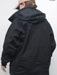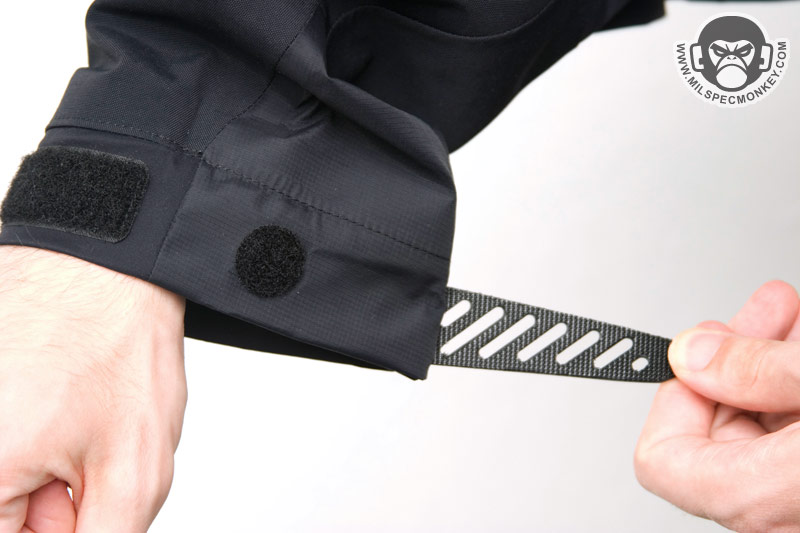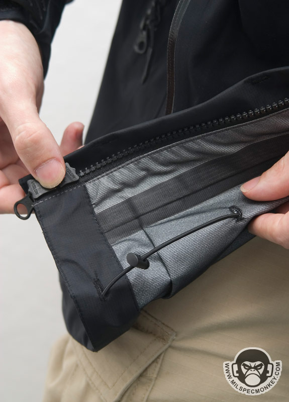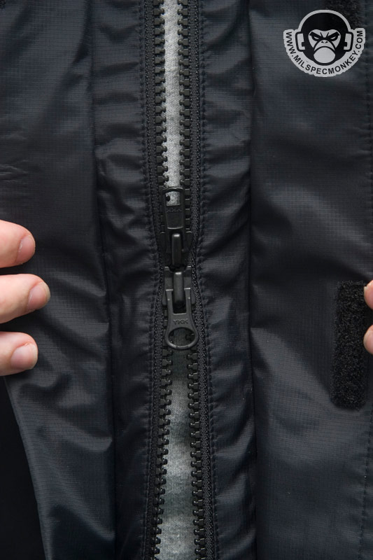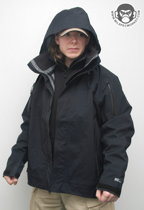 When you know the weather is going to be the suck, this is when you want layer 3. The Element Shell is water and wind proof based on a breathable 3-layer laminate hard-shell. All seams have been sealed internally to insure the water-proof performance. External pockets include 2 large side hand pockets and 2 shoulder pockets. Each pocket has water-proof zipper seals and use the nice custom zipper pulls as seen on the ops jacket. The same zipper setups, except with double sliders, are used on the sides for long pit-zips to allow easy ventilation control. Only the upper slider comes with a zipper pull so if one finds themselves preferring to unzip in a up to down motion, the pull can be removed and installed onto the lower slider. The main opening of the jacket uses a dual-direction zipper which is then made weather-proof with a flap that stays in place with velcro. Many areas include shock-cord and cordlock setups which are at the waist/tailbone area, the frontal bottom, and in the hood on both the opening compression and horizontal "headband" compression. The headband and tailbone cordlocks are a little harder to get to since located on the exterior and interior back sides respectively, but their existence is appreciated for adjustability. Another cool thing about the hood is that the upper back of the jacket has a built in pocket where the hood can be stored when not in use. This is much nicer than having a hood flop around when you don't really need it. As you may have guessed, deployment of the hood from the pocket is easier than stowing which requires taking the jacket off to do effectively. The collar area interior has a nice patch of fleece for comfort making this be the only area one might need to worry about getting wet. Even if a full interior drenching somehow occurs, the fleece is thin enough to dry reasonably fast. The cuffs are adjustable using loop velcro and rubbery straps with velcro compatible hooks built in. The velco dot is good for holding the straps when full hand opening is desired and the longer velcro strips allow the cuffs to be tightened on up. I like the rubber straps since they appear durable and conform to the arm curve. Since there isn't additional padding, the Layer 3 Element shell isn't made for the harsh cold, however it makes a great shell ready for adventures including hurricanes. Don't forget, what Layer 3 lacks in warmth can easily be solved with layers 1 and 2. When combined you got yourself a mean cold and water fighting jacket package.
