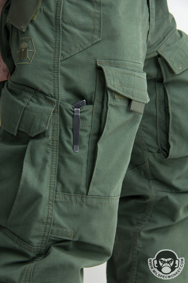 Not done with the pocket party yet, there are still some asymmetric bonuses. On the upper right side is a velcro flapped pocket good for multitool sized items which includes other items like flashlights and pistol magazines. The flap is both adjustable and removable to accommodate more item sizes. Over on the left side is a good dose of PALS webbing to let one get creative adding a pouch such as a mag or phone pouch. Then near the cargo pockets there is a folded knife pocket on the right side, which can be handy if you ran out of room in the hand pocket and then on the left side is a similar pocket setup that has been divided in 2 to hold a couple pens.