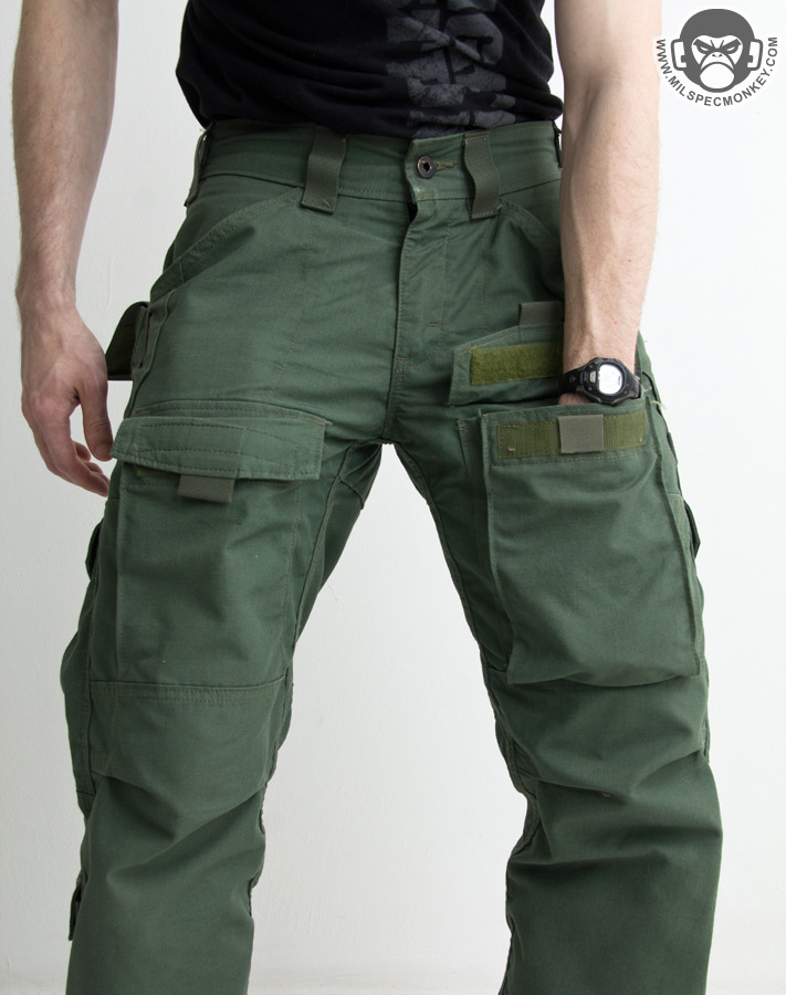 As expected there are also good sized cargo pockets, they happen to be positioned a little further back than most pants with the bottoms near the knee bend point being about the norm. By default they already have a good amount of billow potential and can billow out even further by releasing the side snaps. I added loop velcro to the hook on these pockets as well for one handed ease. I like how the flaps have their own grip pockets to give a positive opening and also are different than the thigh pockets which use more of a pull tab. Since tactical situations can cause one to get in some wacky positions, it is nice to be able to confirm which pocket is which by only touch.