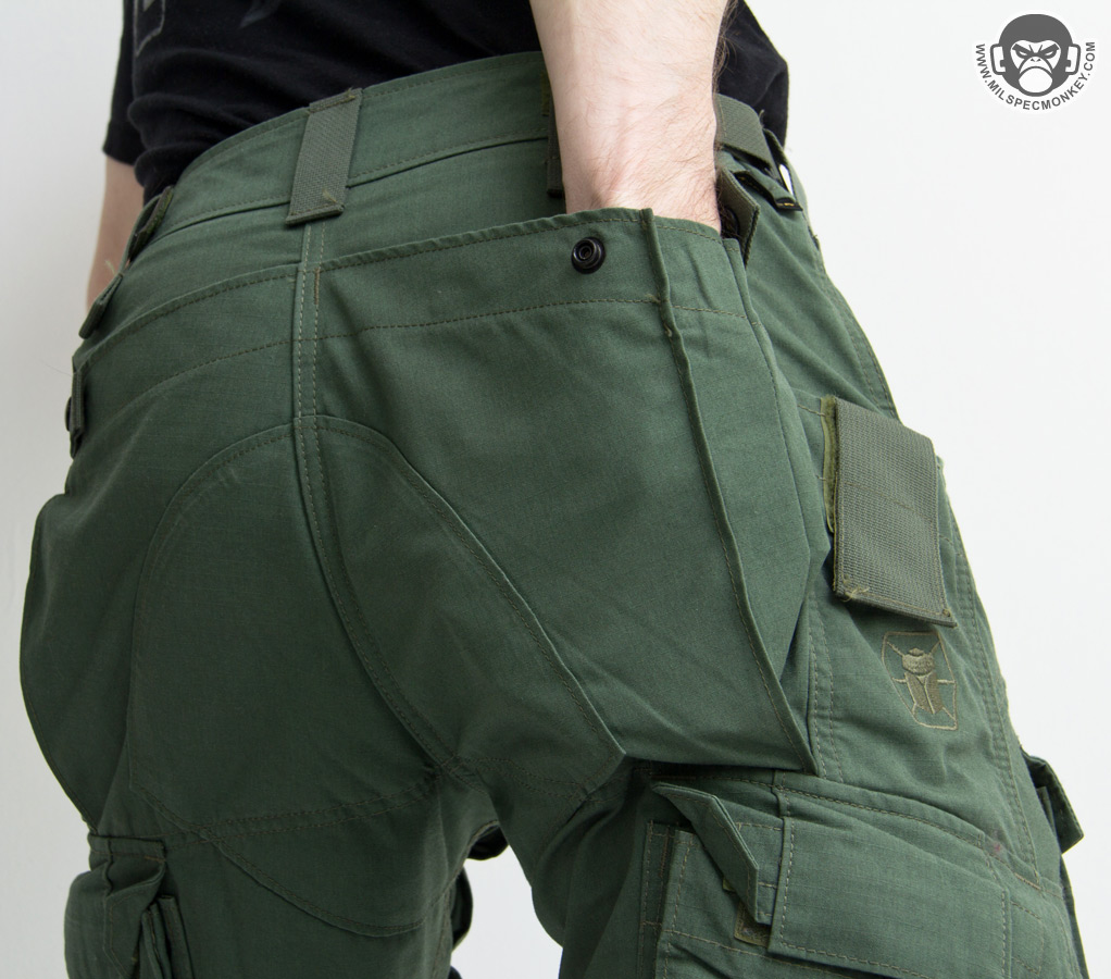 The back butt pockets are roomy to begin with and sport a similar snap system as the cargo pockets. This allows them to billow out even further to offer some very diverse holding options, enough to even be considered a dump pouch. The snaps work well so the pockets don't bust open on their own, as opposed to another connection method like velcro. No flaps are on these back pockets either for ease of use yet as a balance to security, the belt loops above these back pockets have extra loops for lanyard connection points. A little further down are calf pockets which perhaps get less use, but are still handy for lighter weight stash zones.