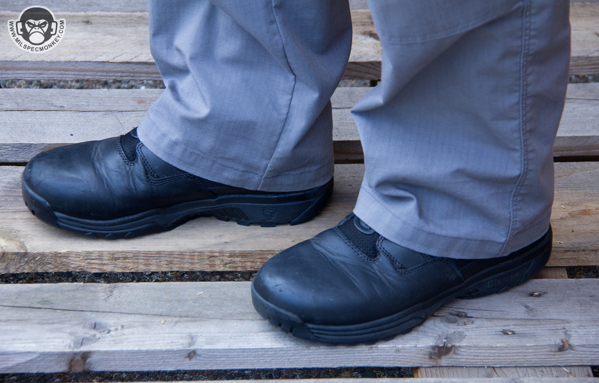 Out of the box the Strike shoes are good and comfy so there isn't really much of a break in period needed. For my personal experience, being the small monkey I am, sizing can be a little tricky as I'm kind of borderline size 6.5 / 7 on footwear. Usually 7 is the smallest places make so I'm used to making do. As is I max out the tightness capability when going for a snug fit on the Strike, but a slim shoe insert can help offset this issue if I find myself needing additional tightness more often. I'd say the design goal of the Strike and what I wanted them for is certainly achieved: to be a convenient/comfy shoe that looks overall simple and plain, yet also are durable enough to keep up with tactical tasks when needed. I found the sole/tread to be good for various urban surfaces. Overall solid grip without being clompy while running, just a little bit of squeak on interior hardwoods and similar super flat surfaces.