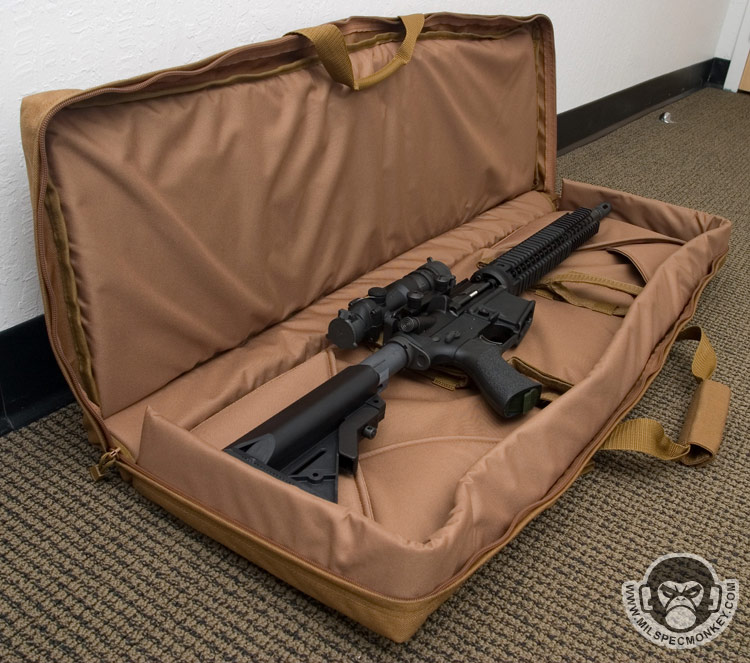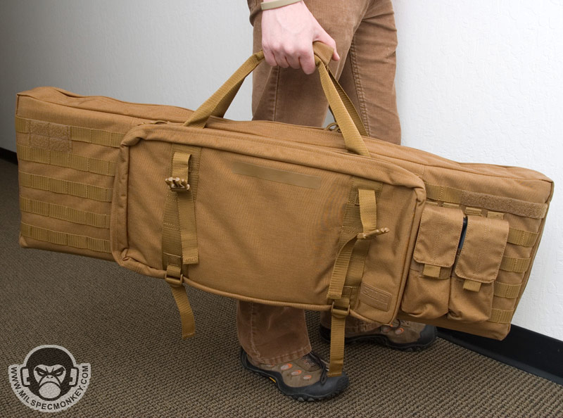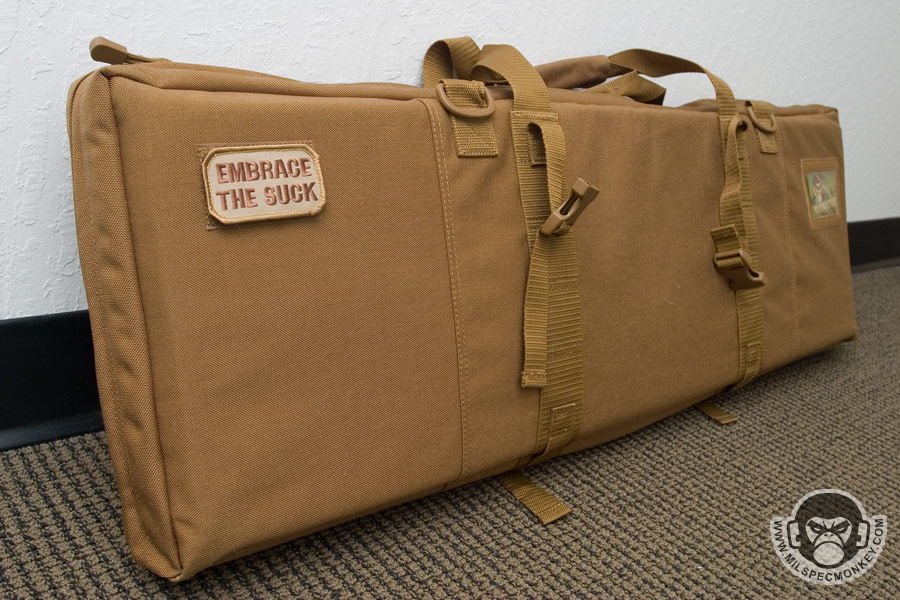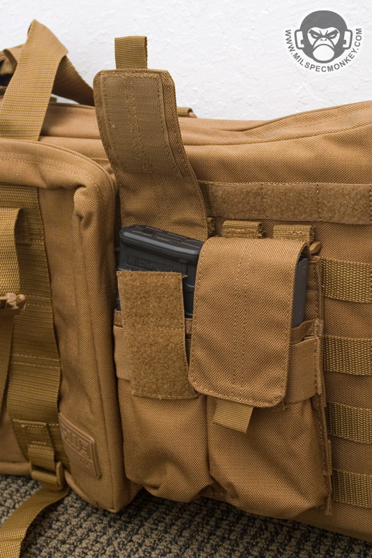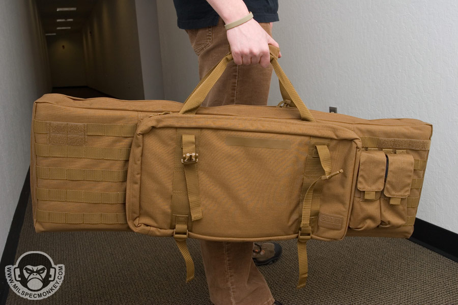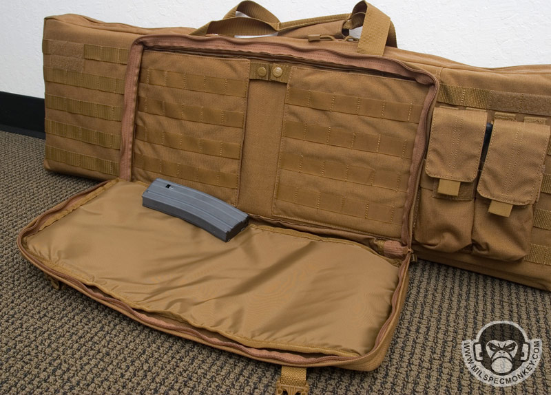 The case is outfitted with top and bottom compression straps and a removable shoulder strap that use National Molding UTX Duraflex hardware. The front of the case is equipped with PALs loop capable of accepting any PALS compatible pouches. The case's main and front compartments are equipped with durable YKK double zippers. The main compartment is surrounded by thick 20mm padding and features envelope dividers in the corners that allow the user to quickly store and retain a weapon. The main compartment is also equipped with four hook and loop lashing points that allow the weapon to be stored in any position. The front smaller compartment is also padded on all sides and contains divider panels with additional PALs loop that allows the user a convenient place to store optics and smaller pouches. The exterior of the smaller compartment also features a small rubberized section that allows the user to write his name on the case with a permanent marker. Both sides of the case offer small sections of loop tape for a name tape and flag, unit, morale patches. Additionally, the back of the cases provide the user a windowed panel to insert a business card or ID. Currently, all the case come with a free VTAC Double Mag Pouch that retails around $20.