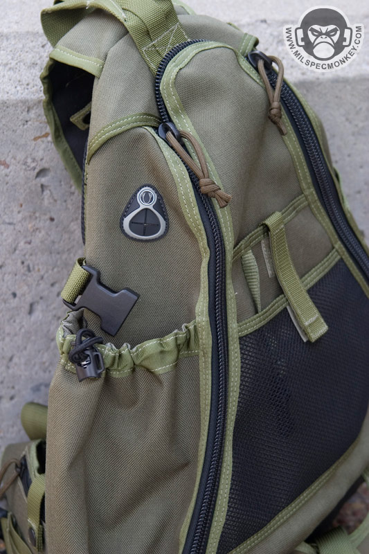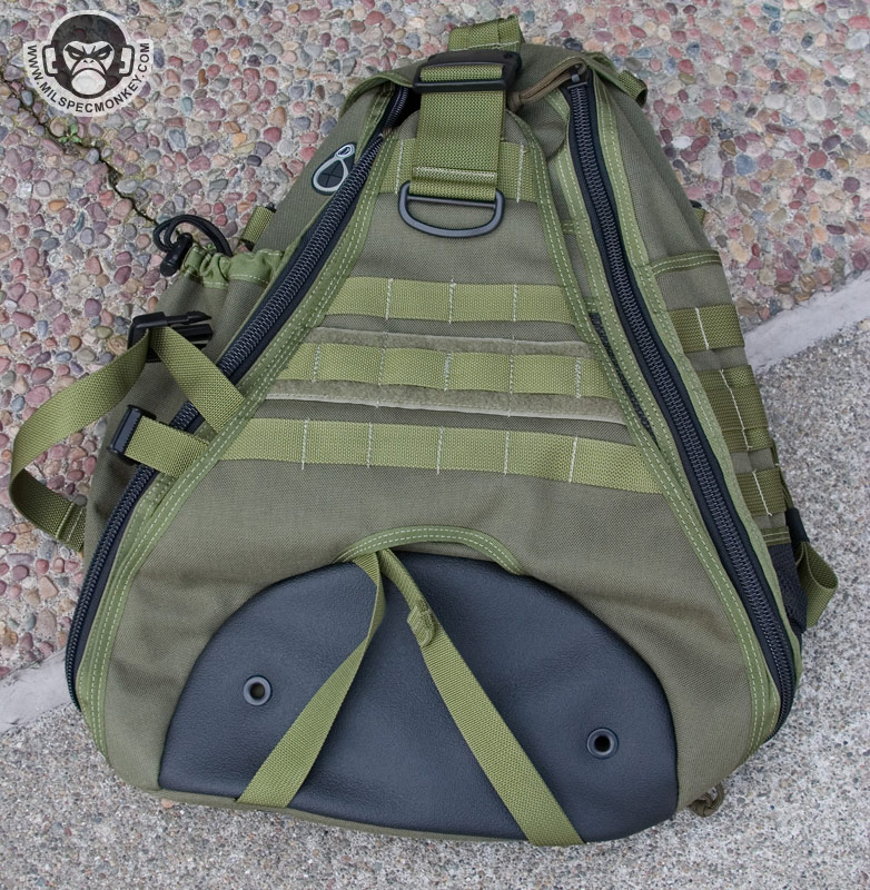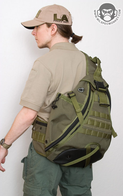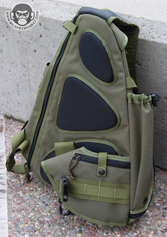 The Monsoon certainly is a unique design appealing more to the urban market, but certainly built tough enough for more demanding tasks. The teardrop shape is a little deceptive in which one can fit more than most think upon first impressions. As expected from the gearslinger name, this is a thick 1 strap shoulder bag design. The first outer flap is a little odd offhand, but allows for a platform to store bedrolls and similar items. The compression straps then can be under or ontop as desired. One side of the pack has PALS webbing and a small mesh sleeve while the other has a nice big Nalgene pouch. Next comes the double zipper main area which has extra sleeves and slim zipper compartments. Also inside is a side pouch for electronics like Ipods and nearby above is a cool rubber headphone porthole. In the far back is the hydration pocket area which has the usual loop velcro to allow for accessories. This pack is generally well padded, but I feel it is made for larger people. I am unable to tighten it to be snug and it rides a bit low. I will see if I can mod the main strap to be smaller soon for a better fit to my monkey size. The 2" velcro'd webbing on the front is for Maxpedition's sheath accessories. Currently available in Black, OD Green, Khaki, and ACU.