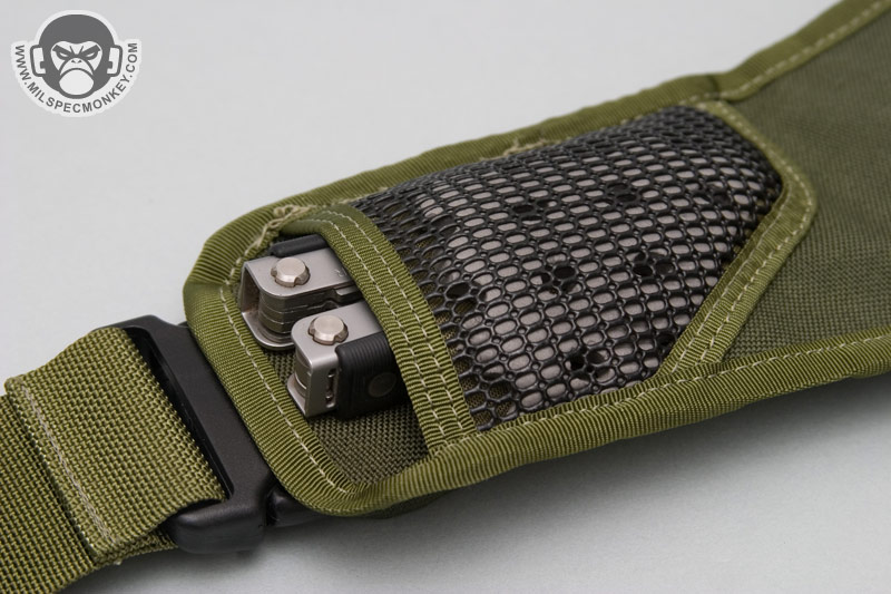 The adjustable shoulder strap has one female and one male side and comes with a removable shoulder pad. The pad is similar to the old style with velcro flaps, but the bottom now uses the foam with rubberized nylon grid. The connection points back on the actual pouch have elastic loops which are great for having over the SRBs to help prevent accidental opening. If one does not need this and wants easier operation, they simply push SRB out under the elastic and let it rest on top.