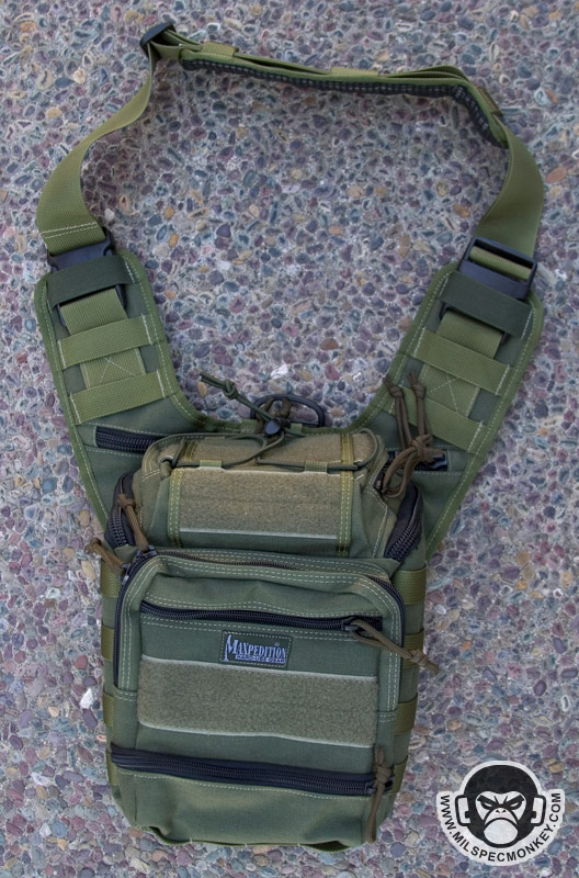 While the Colossus went in the size increase direction for the Versipack line, the Manta went the opposite way. The Manta on its own is not much more than beefy shoulder strapped CCW pocket, but has huge customization possibilities when other pouches are added. Due to all the PALS webbing on the front of the Manta, this makes a great platform to form the Versipack you always wanted or just need on specific day. One simply attaches other PALS compatible pouches as desired. The upper area is 3 Rows x 6 Channels (not counting 2 extra loops up top) and the lower area is 2 Rows x 4 Channels. The upper area has loop velcro between the PALS rows for ID patches. I'm not a fan of the Maxpedition logo being in the middle of the upper velcro strip, but one can destich it off without too much hassle. The lower area comes with a shock cord and cord lock rig and is ontop of a sleeve which is good for flashlight like items. I personally would have gone with 2 Rows x 6 Channels for the lower area. The sleeve area would be lost or harder to use, but this would allow a lot more mounting options. When creating loadouts for the Manta I find myself adding pouches where I want to, but they are less secure since the PALS webbing I spoke of is not there.