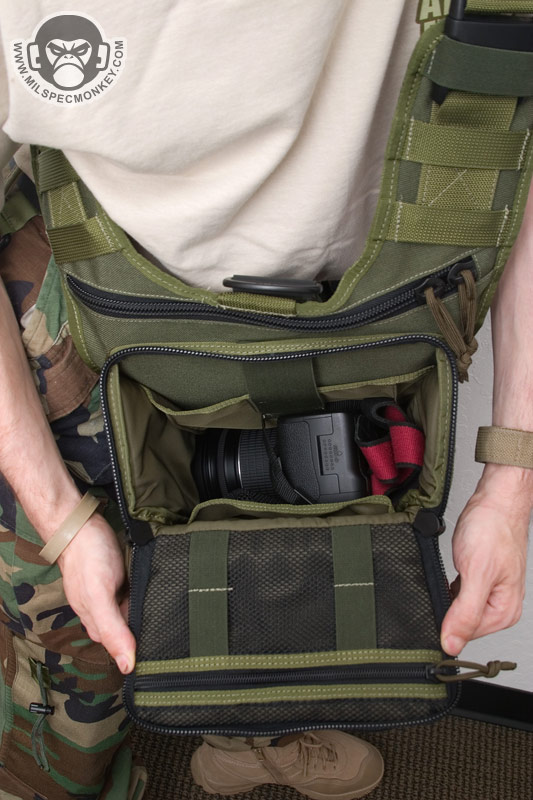 There is a new big boy in Versipack town and his name is Colossus. The Jumbo was a big version of the Fatboy, but the Colossus branches off into its own breed. The base construction starts off with an ambidextrous design rather than worrying about separate regular and S-type versions. The big show is definitely the main pouch which is now bigger and fully padded. The inner frontal side has a sleeve with elastic velcro flap and the inner back side has a sleeve/mesh sleeve combo. The mesh sleeve has been sewn down the middle to form 2 pockets. Although you can fit a lot of different things in the main pocket, the first thing I had in mind was my DSLR camera. I could do without the inner sleeves for my uses since they can snag when putting the camera in, but I think most people will find them useful. Tis better to be able to cut them out rather than wish they were there. On my Jumbo I added in some extra foam on my own, now mister Colossus comes with it standard. How the main pocket opens is also a huge plus for me. Double zippers open up the flap away from you to have immediate and free access to the main goods. The Jumbo is easy to open, but one must manage the main big flap when getting to the main pocket.