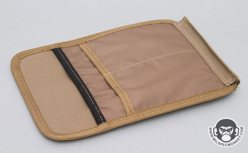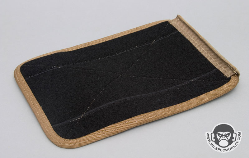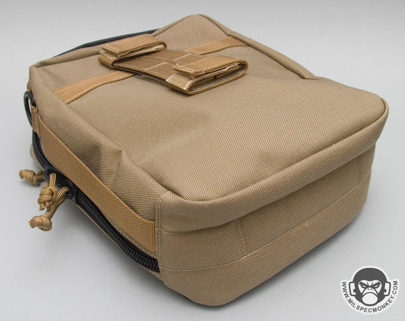 On the front side is a flap with a thin zippered pocket and a PALS matrix of 4 channels and 2 rows. The extra loop velcro under the PALS is to interface with Maxpedition sheath products. When the flap is lifted up the big frontal mesh sleeve pocket is accessible. The flap connects to the mesh sleeve with velcro and the mesh sleeve is held down to the pouch with a inner velcro flap. I was a little confused about the inner velcro flap at first, but I can see where it allows for closure while more goods are in the mesh pocket. I'll note here that the mesh pocket is big and useful, but having the PALS flap be held down by a small velcro area is a little unsecure. The pouch won't be harmed by use, but the flap will likely be "floppy" if other pouches are attached the the PALS flap and used during heavy movement. If you only plan to wear the pouch at a walking pace, then don't worry about it.