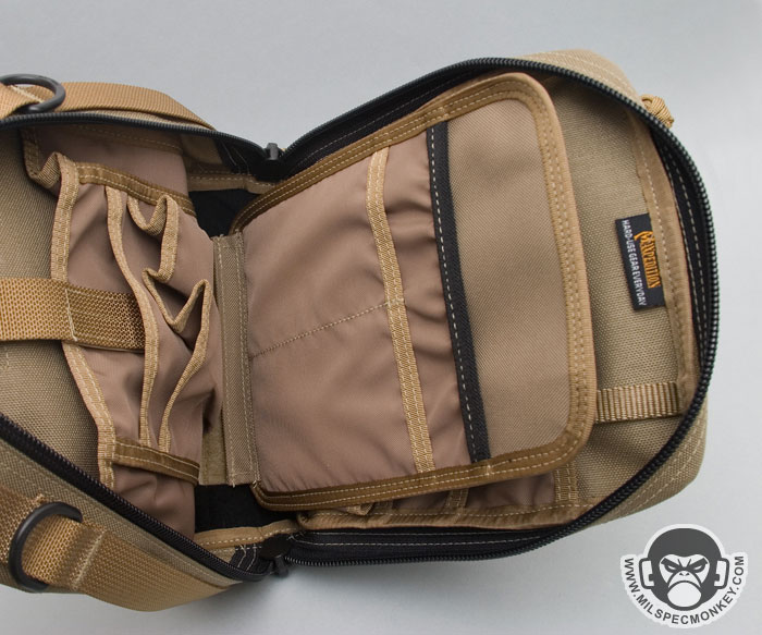After opening up the main double zippers we get to the pocket fiesta of the inside. The Neatfreak zippers go down pretty far, but not enough to call it clamshell style. The back interior consists of: a large expandable depth sleeve pocket with velcro webbing strap, a medium sized thin sleeve, and 2 tall pockets about flashlight sized. The main large back sleeve with the strap can hold a lot more than it looks.The interior back side has a similar, yet still unique layout of: a plastic lanyard clip on thin webbing, large back sleeve, medium sleeve with a little expansion, 2 tall flashlight sized pockets with velcro flaps which also have half tall pockets attached to the bottom area of each, and an extra shorter pocket with some expansion on the side. The velcro flaps can be used to cover both the tall and short flashlight sized pockets, or just the tall ones. The flaps are kinda meh, since they are just raw velcro. I would have liked them more as webbing with velcro sewn on. As is, they will still secure objects inside. In the middle of the inside is the cool modular and removable divider velcro panel. One side is all loop velcro for modular attachments / pouches while the other side is 1 medium sleeve and 2 half-size sleeves good for small papers or pens. Depending how one uses the panel, they can go for more EDC carrying capacity or spice it up with a modular holster for some CCW action.