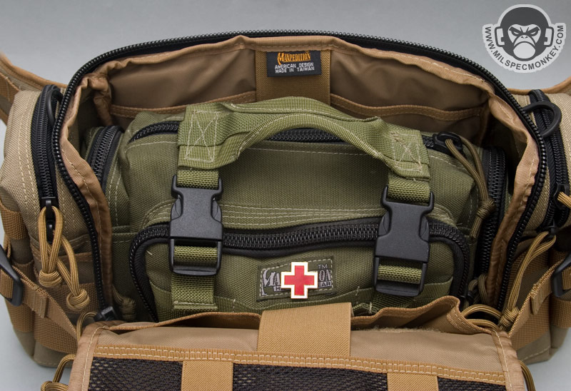 Moving down is the main compartment. This also opens up with double zippers which can get a little confusing with the upper compartment zippers. I recommend trying to keep them staggered from each other to make things easier. The zippers go further down the pouch to make for a unique wide opening that allows full access without flopping straight down. This compartment also opens away from the user which greatly makes it vastly easier to use while still on your body. On the top of the inner main area is another larger zippered mesh pocket that has 2 vertical elastic loops. These are good for further slim organization and the loops work great for medical items. Inside the core pouch are sleeves with elastic velcro flaps on the front and back. Both also have loop velcro panels on the inside to add Maxpedition accessories like the 3 mag holder. Nothing else is on the sides, and a there is a grommet on the bottom for drainage. I feel this is a good compromise of organization ability without extra crap getting in the way.