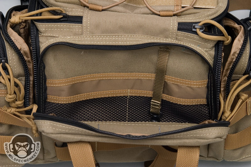 Let’s go ahead and break down all the pockets and what-not. At the very top is the Maxpedition style sleeve with shock cord and cord-lock rig. Loop velcro is down the middle for patches. The sleeve and cord allow you to ram items in there for low security, yet easy to access capability. If this area is a little more than you need, feel free to take off the cord rig to streamline things up a bit. This top area has its own pocket with double zipper clam-shell opening that folds away from the user. Inside is a sleeve with 1" horizontal elastic loops on one side and a zippered mesh pocket on the other. This is a great place for the smaller goodies.