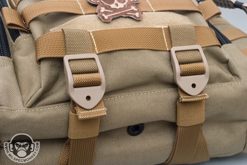 The sides have cloned medium sized pouches with double zipper access. The exterior has a good dose of PALS for adding pouches or general connection points, but the side compression straps aggressively get in the way of how far one can open these side pockets. One can open the pocket fully, but then it is a hassle to retrieve the back pull cord the due to the compression strap covering it. On the inner-back of these side pockets are simple mesh sleeve dividers and bottoms have bonus grommets. Although easy to miss, the exterior front of each side pocket has a slim sleeve good for longer items like flashlights and tools.