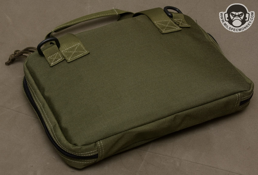I splurged for the big version here, but note an 8"x10" version is also available. This pistol case is a straightforward, but solid design. The exterior front has loop velcro area and a generally clean back with extra D-rings for optional shoulder straps. Substantial handles are integrated with padding in the grip area.