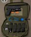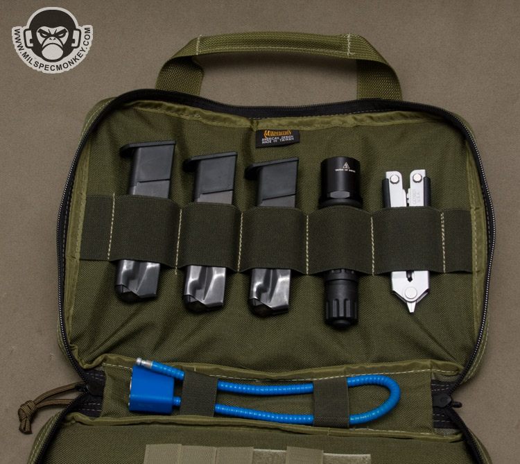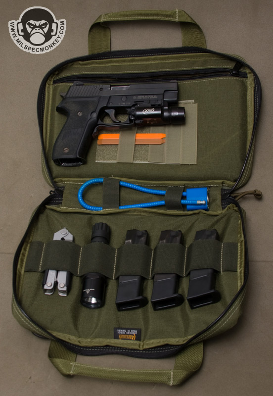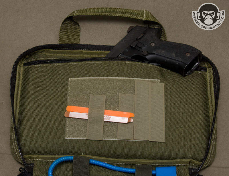 The main opening is a double zipper clamshell to allow a full fold out. As a nice touch these zippers are lock-able. Inside, one side has a nice piece of elastic webbing which can hold 5 pistol mags or similar sized items as shown. There is some extra space on the ends good for holding tools and pens. On the other side is a zippered pocket and loop velcro with hook velcro pieces included. I think the idea was in the right place, but I couldn't find a good use for these velcro strips. They didn't really seem to hold any of my pistol related items very well. For a change I recommend making the loop velcro the full width of the pouch so modular velcro pouches / panels can be used. As for the zippered pouch area this works just fine for putting your pistola in there. Both sides are padded to keep your hardware nice and protected. As you can see on this 8x12 version there is plenty of space to fit a tricked out pistol inside. In the center there are 2 pieces of elastic webbing which give some more gear holding options. Overall the case works well as a pistol holder as intended. When hitting up the range, it makes for a good setup for reloading, maintenance, and a place to safely lay your weapon.
