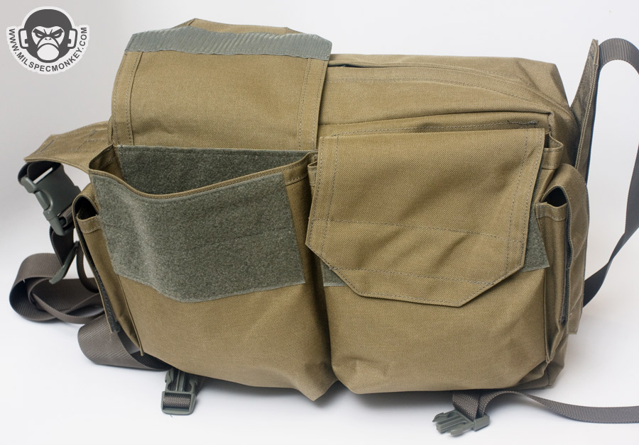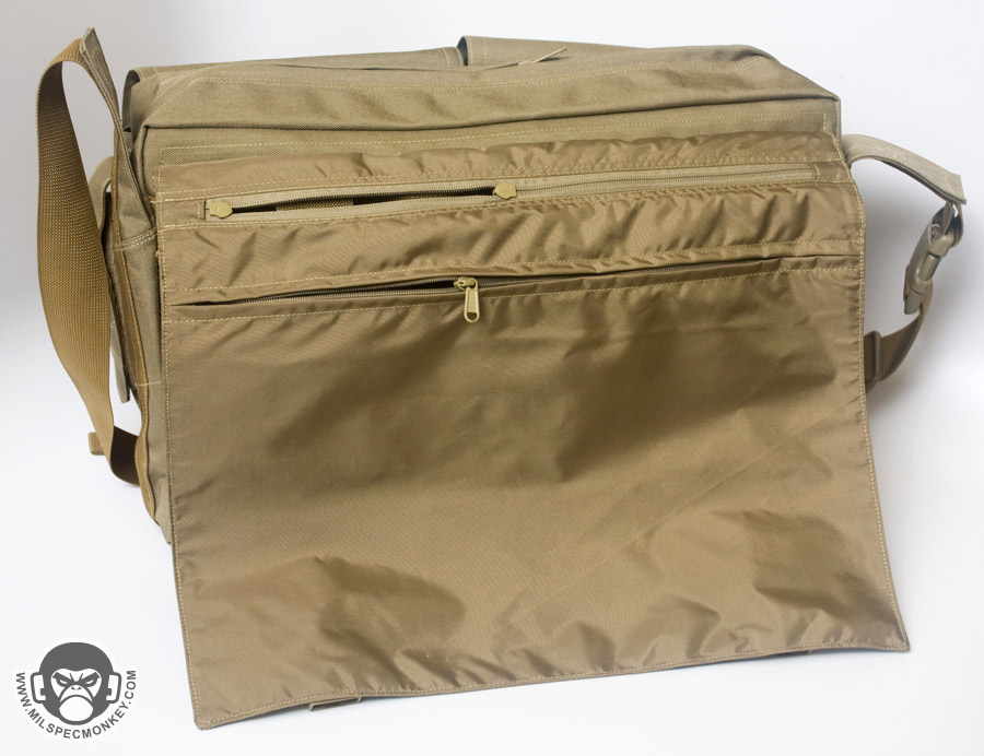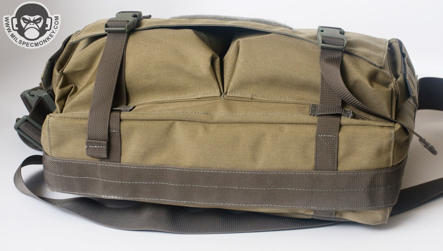 Staying with the common messenger bag format, the main closure is a big ass flap that uses two 1" SRB buckles to secure. A generous amount of loop velcro is available for patches or nametapes. This setup is great for adjustability on load sizes, however kinda slow speed wise where the SRB buckles must be released or buckled when fully opening or closing the bag. To get around this classic drawback, there is a crafty double zipper on the upper back to allow quick bag access. The opening may not be as large as when the flap is open, however it works great for quick item grabs. A substantial handle is also on the upper back. Due to the placement it is more of a grab handle since when carrying it by only this handle the bag will hang at a tilt angle. The extra large piece of fabric on the back is somewhat sneaky where even I didn't know what the hell it was till I asked. Turns out, it is so you can easily mount the bags on roller luggage that have the telescoping handles. I'm kinda conflicted on the feature where it works as intended, however I don't think many messenger bag users travel with rolling luggage as well. In my opinion a simple sleeve pocket would be more useful. Also on the back is a 1" SRB waist strap setup that is good for securing the bag during movement. It is modular so can be removed if the user feels they will never use it.