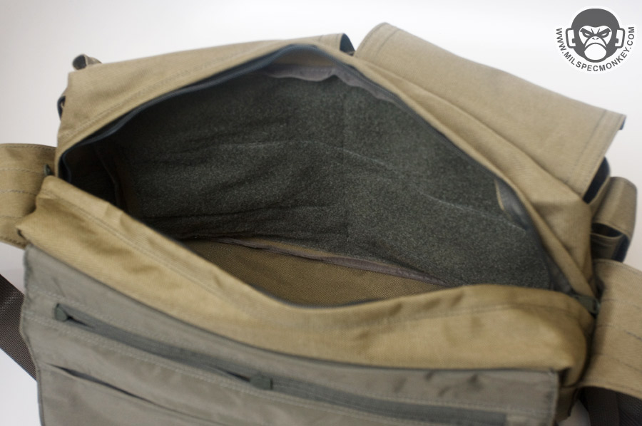 On the interior the main flap itself has a slim yet large single zippered pocket good for documents and or smaller items. The main compartment is more protected than most messenger bags including a double zipper closure with rain flaps. This causes loss of the large opening some may enjoy on classic messenger bags, however gives huge security improvements. With these Maxpedition designs, users can leave the main compartment open with the flap secured to allow fast access through the flap zipper or, have both the main compartment and flap closed for full security. For some reason the double zippers to the main compartment have no pull cords which sucks as they tend to hide under the rain flaps. This makes usage quite a hassle, but luckily is easily fixed cheaply by adding any sort of pull cords. Having rain flaps at all is somewhat odd since that is the main flap's job, but perhaps this is to allow users options to roll with the main flap open. Inside the main compartment the space is simplistic yet lined with fuzzy loop velcro goodness. The front and back is lined completely with loop giving full modular velcro pouch possibilities. As a bonus even the slim sides have some loop, enough to hold the smaller attachments. To clarify, no velcro pouches are included, but I do show some in the pics that Maxpedition offers. They add a lot of customization options rather than being stuck with just a slim sleeve and a couple pen pockets like on typical messenger bags.