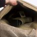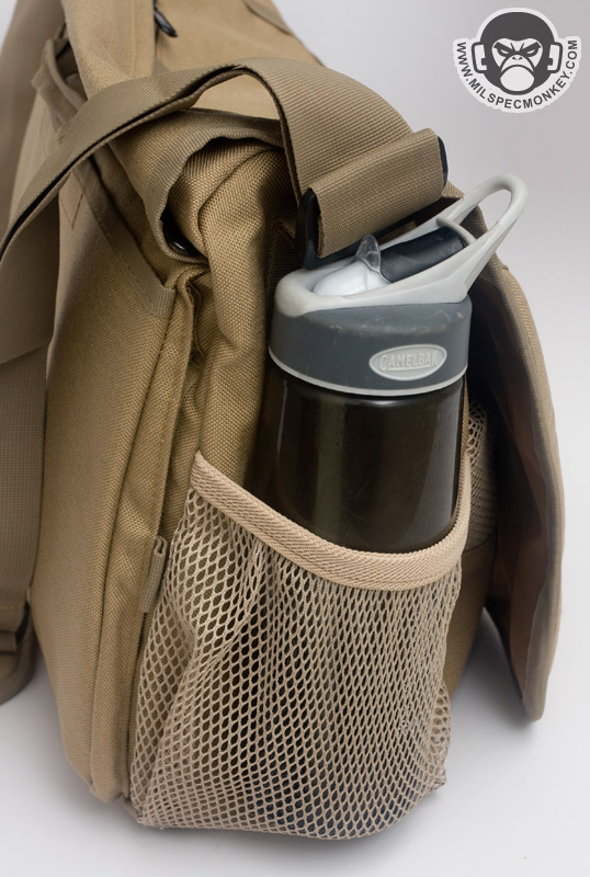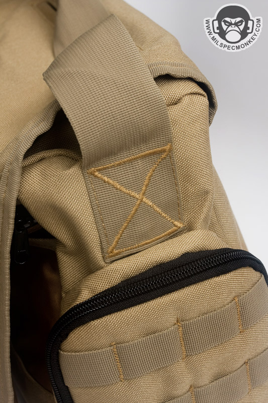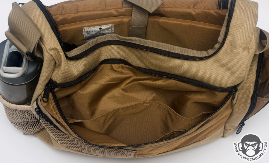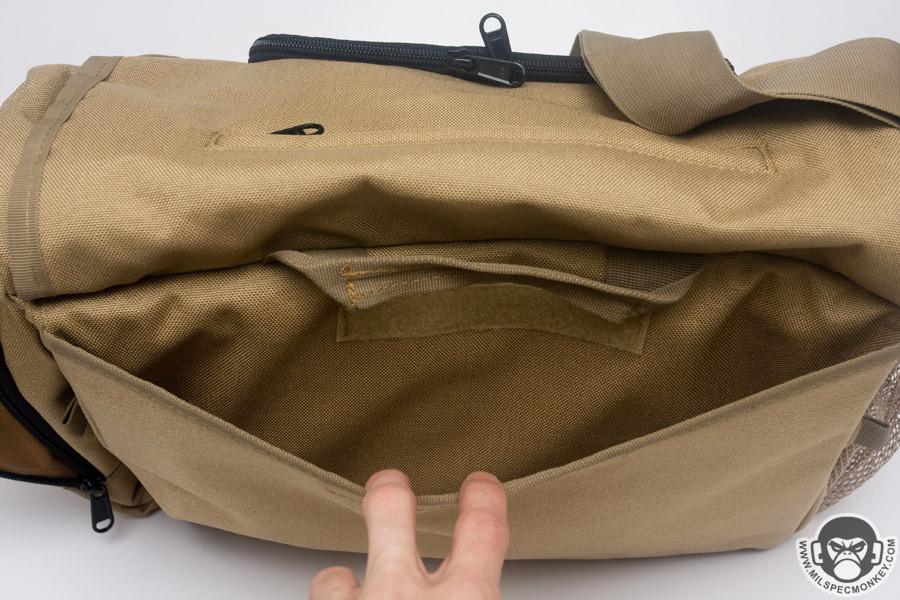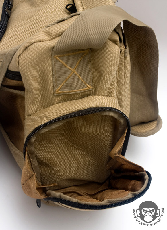 The shoulder strap is simple and comes with a non-slip pad. Tri-glides are used for size adjustment and the webbing is sewn on with an embroidery style variant box stitch. The exterior front pocket opens with double zippers. Inside is a sleeve pocket party with a plastic lanyard. As you can guess it is good for small papers and other thin admin items. The main flap can be secured with a SRB, which comes with a nice integrated velcro strap to manage the slack. When not using the SRB, the main flap is also held in place with a fairly small piece of velcro. It may not be big, yet it is all one needs to keep the flap in place and allow for easy opening. One side of the Jack Bag is a mesh bottle holder while the other is an accessory pocket. The bottle pocket will accommodate most personal sized containers. There was a small quality control issue where the mesh was ripping out in some places on my Tan bag sample, however all was well on the black one. Other than that the materials and quality seemed solid on the bags. Back to the accessory pocket, it uses dual zippers and has PALS webbing on the exterior. Folding sides are in the interior to assist in keeping goods inside even when the pocket is fully opened. Now I like PALS webbing as much as the next tac guy, but it may have been better to leave it off this side pocket in the spirit of a more discreet look. I don't really see myself adding another pouch on this side as it would make the bag a little awkwardly long and may negatively affect ease of use on the accessory pocket. Up on top of the Jack Bag is a zipper to get access to the interior without messing with the flap. Having a zipper at all is great, but the zipper length is a little short. Only smaller items will fit through the opening and it tends to take both hands to really open up the hole to be able to see items inside. I know the bag isn't super big to begin with, but I think this zipper could be longer without negative results. The back side has a grab handle and a large sleeve pocket with velcro closure. Good thing the handle is there as the pocket is a little difficult to open if not grabbing onto it. Perhaps a pull tab would make things easier for one hand operation.