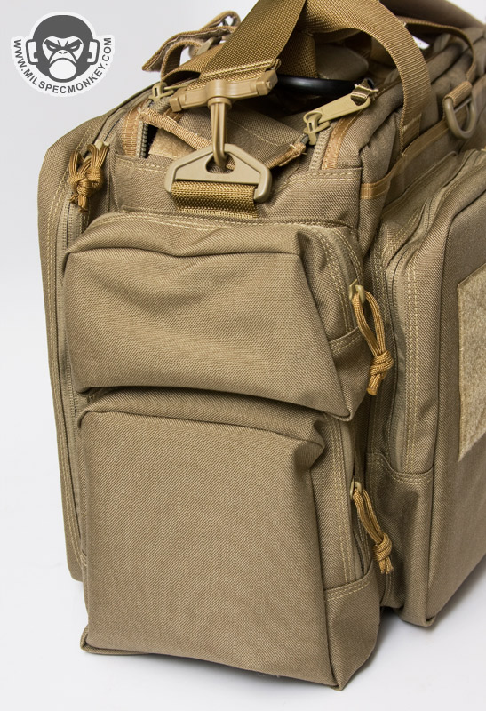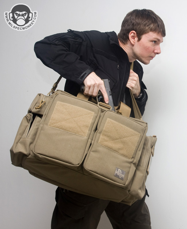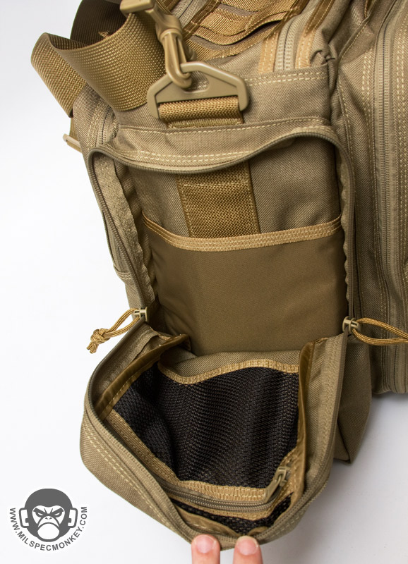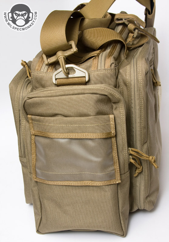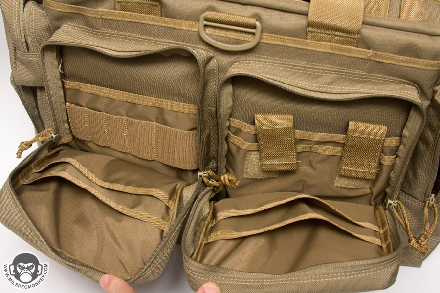 The front changes things up a bit where it now has 2 good sized double zippered pockets that could be considered large GP in size and shape when it comes to tactical pouches. Internally both have plenty of sleeve pockets, but the one on the left has divided elastic good for pens etc, while the pocket on the right has 2 slot pockets with velcro straps for more options. The size of these pockets won't fit many items exactly, but are big enough to hold many different tactical or civilian items from 30 round rifle magazines to big power adapters. Generous amounts of loop velcro are on the exterior for patches. As a welcomed addition, a CCW pocket has been added behind these GP pockets. A 2" D-ring makes for a good tear open assist and the inside has 12" x 7" of loop fun space to allow easy placement of a handgun, pistol magazines, or other tactical accessories. For those not in the know, this pocket is easy to overlook, which is a good attribute when it comes to CCW. The Back side pocket is more like the classic MPB where it is one large admin area with clamshell style opening. On the exterior a single zipper pocket has been added and a horizontal bar/pad to allow stowage on handles of roller-type luggage. The bar can also work like a side grab strap, not so much for carrying, but good for an alternate grab point. Loop velcro is even on the bar, great sizing for a nametape or favorite patch. Inside, the large sleeve pocket is good for magazines(media) and documents with a SRB security strap option. Under that are 2 smaller sleeve pockets, then further down are 3 pockets with billow capability. The flexibility of the 3 new pockets is certainly appreciated as they work great for holding gadgetry. It would have been nice to go ahead and add some elastic or sleeve pockets to the inner flap, but no biggie. What I'll refer to as the left side keeps the 2 zipper pocket layout. They are simple with single zippers and the lower larger pocket has an internal sleeve pocket. With the size variance they help offer a closer possible fit to items you may want to hold. The right side of the MPB XXL has another GP style pocket with integrated ID area on the exterior. Double zippers are still used for the opening and inside is a sleeve pocket and mesh zippered pocket for further organization.