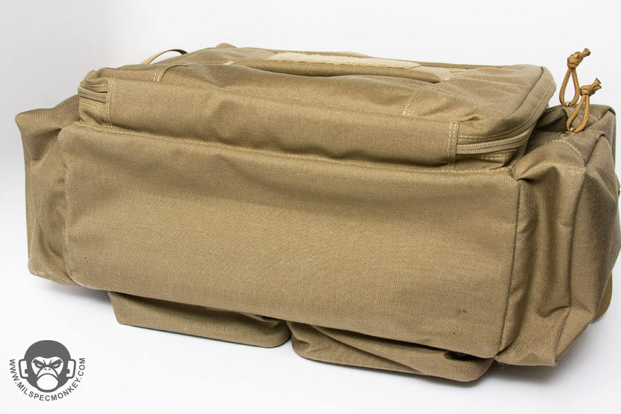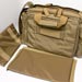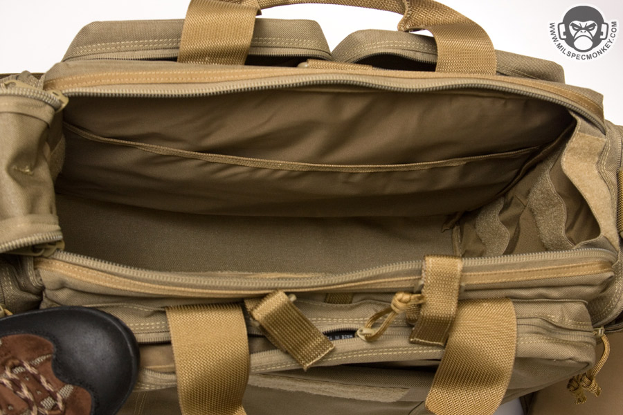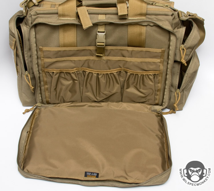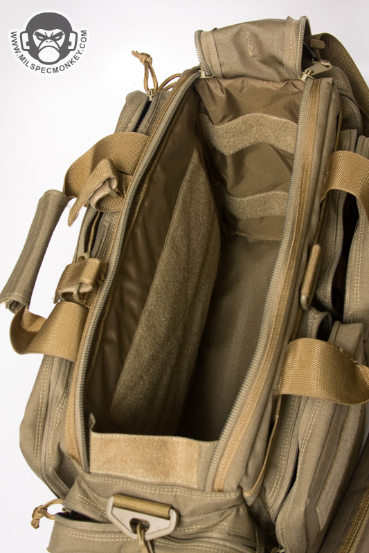 Down into the interior of the whole bag, things are fairly simple, yet with some options. One side is a sleeve pocket while the other has a good patch of loop velcro so one can add CCW action or velcro accessory pockets. The ends also have loop areas, however they are for attachment points for the divider pad. A bottom pad is even modular so one can decide if they want the padding rigidity or to take it out to offer maximum holding space. With this modularity one can accommodate many items with a good fit ranging from laptops, piles of tac gear, to larger sized video cameras.