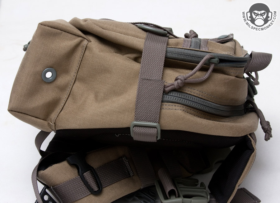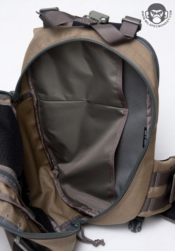 The Noatak uses their standard Y-strap for compression, since not a large pack I'm glad to see there are no extra side compression straps. I know you may be tired about hearing how I never use the Y-strap, but I just don't see myself needing to compress a pack this small. I would however be more likely to use it to secure a rolled up jacked to the pack. As I was saying earlier, the upper front pocket that was on the Sitka is missing, but the loop velcro and shock cord rig are still there forming a "cave" for fun things like knives, flashlights, or collapsible batons. Another global change is that all the main zippers are done in reversed style (teeth facing interior) which seems to be the growing trend. I don't know if it actually helps with water resistance or durability, but I do like the clean flat look they give.
