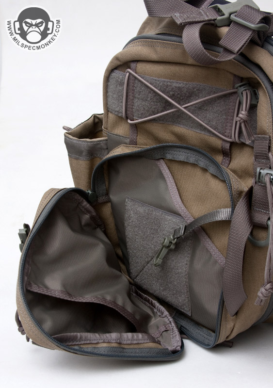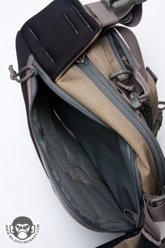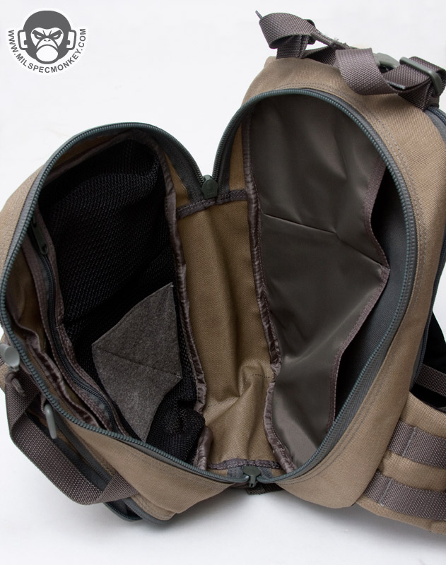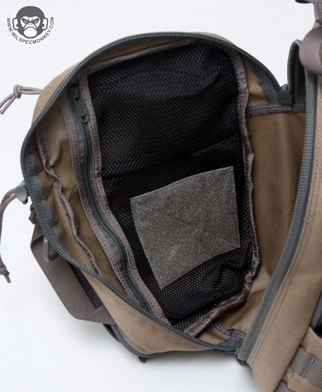 Keeping with the chest access theme, the zipper placement to the main interior is done appropriately. It isn't quite clamshell as that would be floppy, but still a good sized opening. The interior back has simple sleeve pockets divided into one fairly large and one small pocket. The tension of the fabric here makes the pocket useful for both slim and medium thickness items. On the other side, the interior front, a lot is going on starting with a zippered mesh sleeve pocket. It is divided similar to the other side creating large and small pocket areas. The Noatak doesn't have the extra sleeve pocket here as seen on the Sitka, so loop velcro has been added directly to the mesh pocket. This has good potential for CCW or other velcro add-ons. This isn't an ambidextrous pack so some folks may not like that the strap goes over the left shoulder. From using it myself, I didn't feel a huge demand for it to be on a certain shoulder, I think both left and right handed users will be able to operate the pack from back mount to front mount just fine. With the cross strap released, the shoulder strap or main pack portion can be grabbed to then rotate the pack to the desired body location.