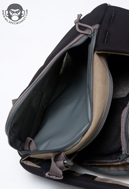 Moving down the exterior, there is a rectangle pocket which I suppose now can just be called the front pocket. A slim zippered pocket gives quick access and has a security snap. The snap makes sense for piece of mind, however since just a slim pocket I am starting to think it may be overkill. The zipper won't undo itself unless you have something odd shaped and heavy inside; thus the snap starts to just get in the way of normal zipper use. Although offset for the zipper, PALS is on the exterior for mounting options. Mounted to the exterior side is a handle which assists in both this pocket and whole pack manipulation. The double zippers opening this pocket are placed with chest mounted access in mind. Inside, sleeve pocket design keeps up with this concept and a key lanyard is included. As an addition there is now loop velcro inside allowing some additional admin or CCW options. On the Noatak exterior side, the webbing and cordlock anti-theft deterrent still is in place. It won't save your backpack from being stolen or anything, but it is used to lock down all of the cord pulls so gremlins will have a much harder time trying to get into any pockets. I'm not big on it myself, but on the bright side a D-ring is on there and you can always get creative with the webbing for lash points. The left exterior side has a generous sized water bottle pocket with cord-lock closure, it can hold both the common Nalgene and Camelbak bottle sizes. As an enhancement, a grommet is even at the bottom so you don't end up with a pocket of mold. The right side is for the most part slick due to the downscale. As a result there is no PALS webbing on the side that was previously on the Sitka. Up top is a pretty serious pull handle making grab and go easier, even has padding. The main shoulder strap is well padded like the whole back of the pack. Compared to older airmeshes used, the backing material is still soft and breathable, yet more durable since it does not interface with hook velcro. A variety of PALS-like webbing is on the shoulder strap exterior to allow general mounting. Since the strap width is minimal and varies, stitching is not present in the middle of the webbing A HK hook is mounted as an attachment option bonus. If one needs to get into heavier movement, a cross strap is available and I like how a tuck-hole was integrated into the bottom back for storage when not in use. Incorporated into the back is a zippered pocket good for holding hydration bladders or concealed weapons thanks to the loop velcro panel inside. Do note that if you rock a hydration bladder, it will need to be smaller than normal and the only available drinking tube opening is down low through the cross strap storage hole. Older pack designs required one to take off their pack to access this pocket, but when chest mounted, opening the zipper is not bad at all on the Noatak.