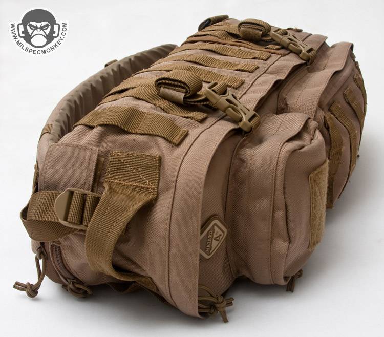 The top sports another drag handle and has a 1" strap under it connecting to the main shoulder strap. Despite looking out of place, this strap actually helps adjust how the pack fits on the user's back. Nearby is a velcro flap for hydration tubes and a zipper opening for alternate options such as for antennas. This slot can also comes in handy if putting a rifle inside that doesn't quite fit, allowing the barrel to stick out of the top. The hydration pocket has an opening so both these ports can be reached through the hydration or main compartment.