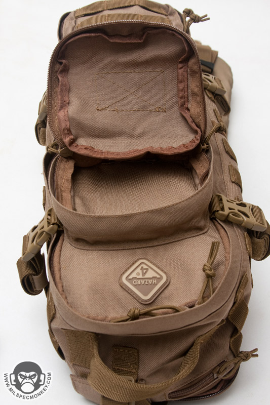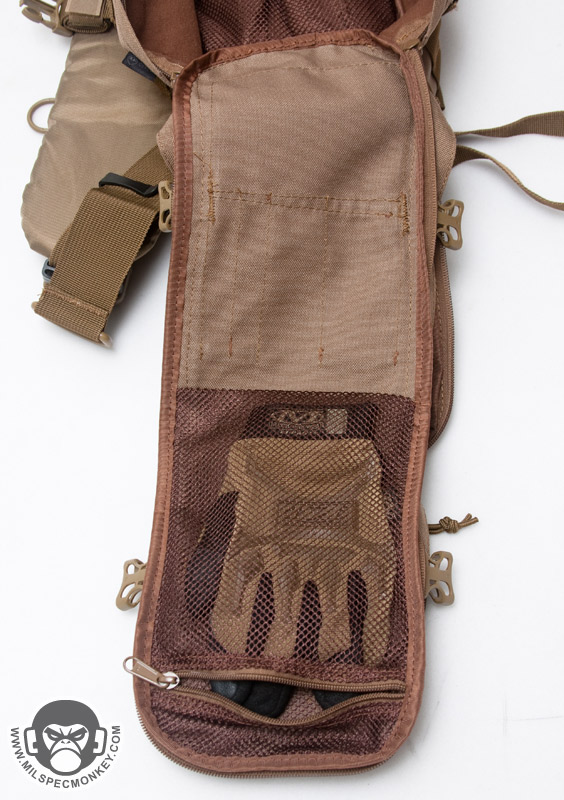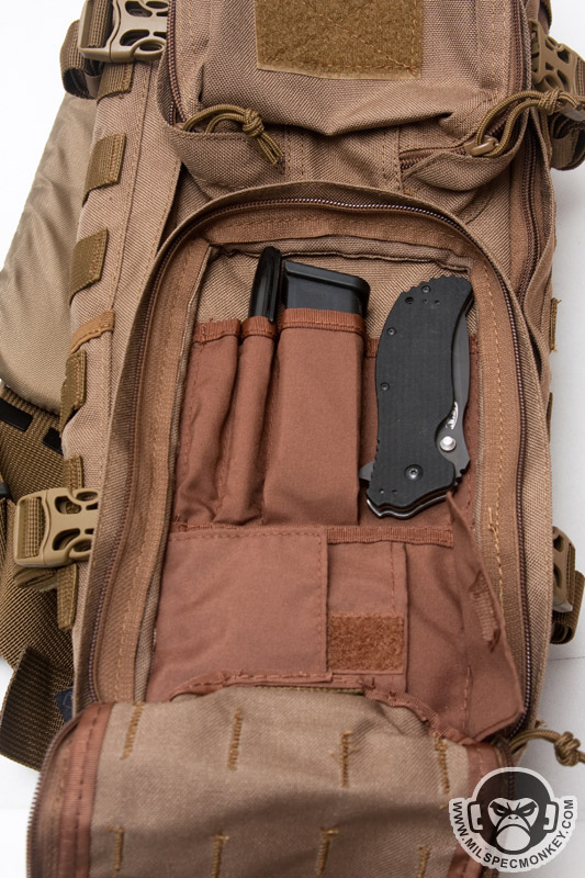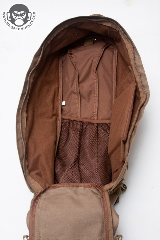 The main compartment opens up with dual zippers and with the compression straps released, makes quite a full opening for easy access. The back has a mesh pocket with elastic top and the flap interior has good sized zippered mesh pocket. The sides are lined with tricot like a camera bag to interface with the supplied divider. The divider is great for sectioning off the pack or can help cushion if having a SBR upper and lower inside. It would be nice if another divider was supplied as that would be handy for smaller item setups like medic bags. As for what can actually fit in this main compartment, it lends itself to holding multiple medium sized items, but not so much on larger gear such as a helmet wont fit. However, there is plenty of room for an E&E, medical, or bug out bag type setup. I was able to fit my medium sized camcorder inside and even used the divider to make room for power supply / wires storage. Keep in mind if you try and use it as a daily pack, it won't fit some common items like say a legal sized sheet of paper without bending or folding.