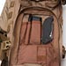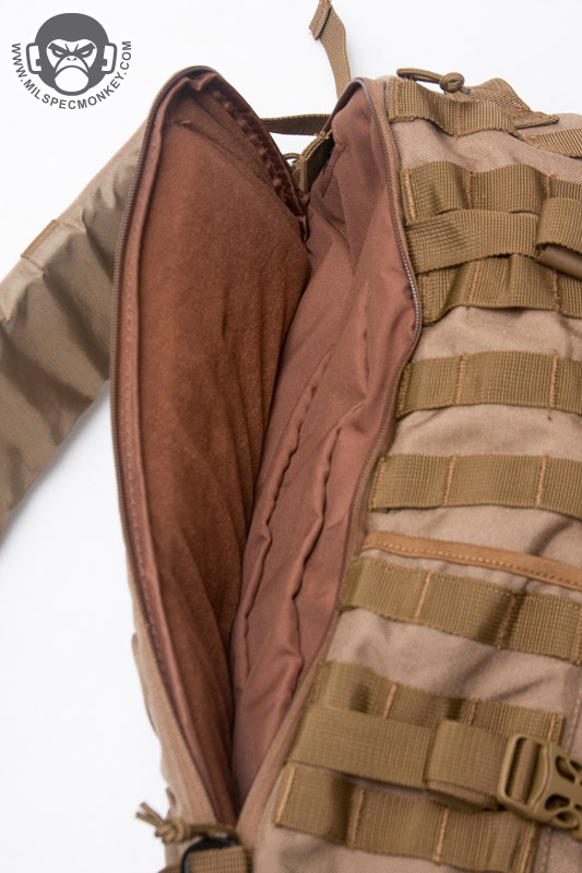 For comfort the whole back has a padded foundation with additional padded ridges to help with airflow. The ridges aren't super tall, however do help and if they were too pronounced it can result in an uncomfortable ride. For durability they are made of the same 1000D material as the rest of the pack rather than a fancy mesh that will wear down more quickly. Near this back area is the hydration pocket which opens with a single zipper to one side. Not a big deal, I just wanted to note the pocket isn't set for ambi use. Inside, one side has tricot material to interface with velcro based attachments such as pistol holsters. This offers some nice flexibility if you don't plan on holding a hydration bladder. If you do however, there is a nice attachment loop up top and an access port to route the drinking tube as desired.