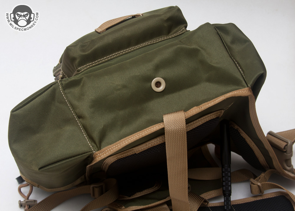 The shoulder strap setup is pretty much the same classic Jumbo style, but comprised of a 1.5" main strap instead of 2". The usual shoulder pad is included which always helps quite a bit with comfort. Although a lot of webbing was taken off on the KISS, a good dose of PALS webbing still remains as a part of the strap area. One side offers PALS webbing and a stash pocket for items like knives, while the other side is a more generic connection point using 2" webbing and loop velcro. The 2" webbing is curious to me at first, but I can see it acting as a "belt" platform for mounting those type pouches to and the velcro is there for patches when not covered. The drag handle is even included which was not on earlier Jumbo designs at all. The back area that touches the user has stayed overall the same offering 3 pad zones. Since the same black airmesh material is used, it is comfy, yet still is one of the most fragile materials on the pack. It will fuzzy up over time and make sure to keep hook velcro away! The belt connection is gone likely since not many people were making use of it anyway.