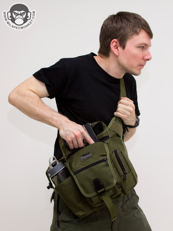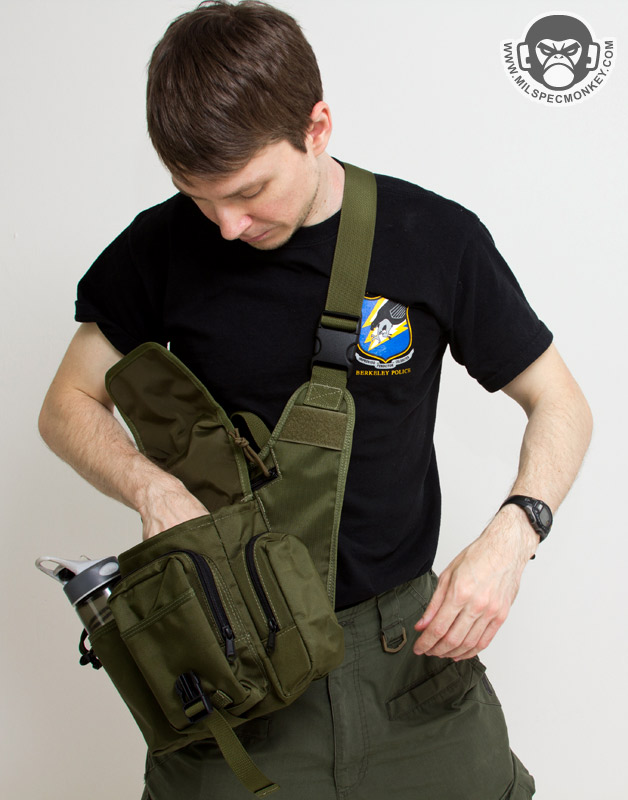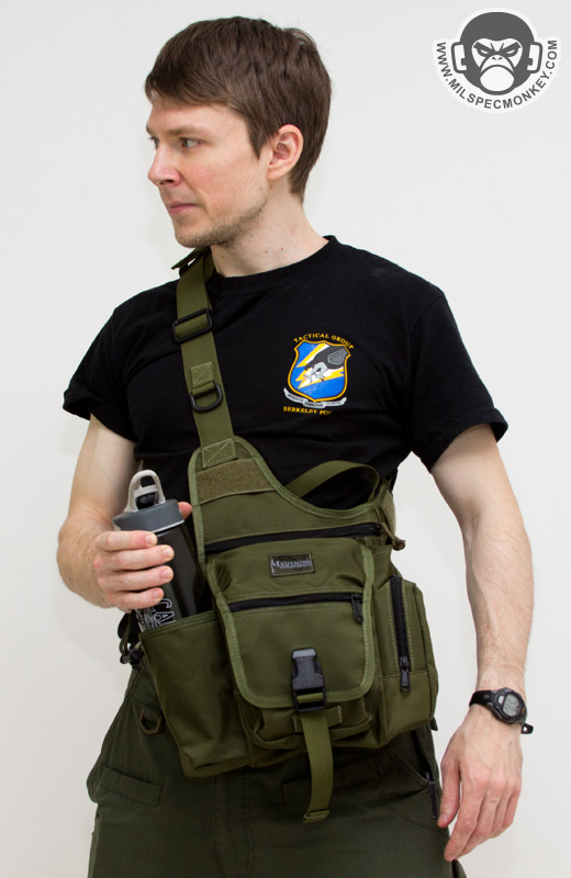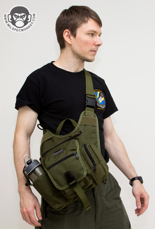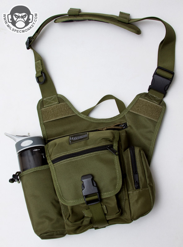 For some of the other changes, the shoulder strap is now 1.5" rather than 2" and the HK snap is a simple plastic D-ring. Ladies will probably like the more slim strap, but those who weighted down their Fatboy may miss the wider 2" strap for long wear comfort; Don't worry the shoulder pad is still included. The phone pouch and extra webbing have been dropped for simple webbing zones with loop to allow patches or Maxpedition sheath pouch attachment. Due to requests in the past a drag handle has been actually added. Rather than a belt snap, the back uses a velcro flap as seen on the Jumbo series. The result will likely be more comfortable for most as the velcro flap lays more flat against one's body. The same back mesh padding is used which is comfortable, however definitely the durability weak point on the bag having the least abrasion resistance and gets thrashed by hook velcro. As a more substantial change, the secondary compartments are totally different. The GTG now has a water bottle pocket and a GP pocket where the original fatboy had the GP pouch on the other side and a flashlight / sheath pocket. It will depend on the user, however I think most will welcome the addition of the water bottle pocket. Personally I'd rather have the water pocket on the other side so easier to access when worn on the right-hand side, the balance I suppose is the GP pouch would be a pain to access (requiring bag shifting for most) if that was done. On that note, to swap the layout there is the option one could get the S-type (lefty) version and just wear it on the right, just keeping consideration the CCW zipper will open the opposite direction. Sadly there is no grommet on the bottom of the water bottle pocket, or anywhere on the bag for that matter, but not a deal breaker.