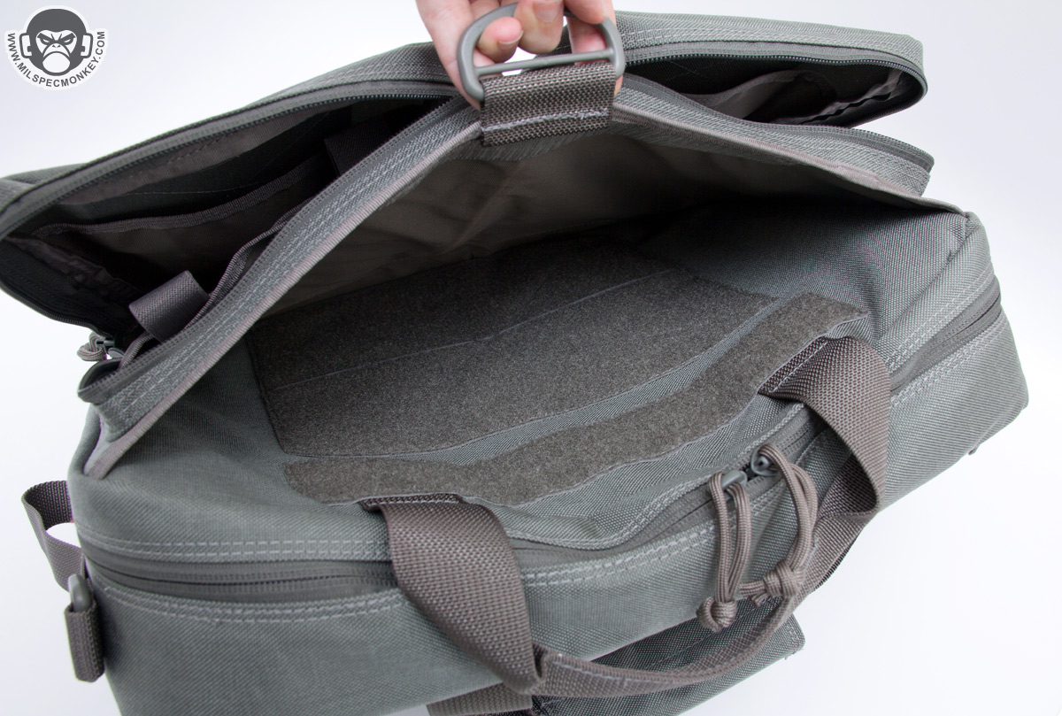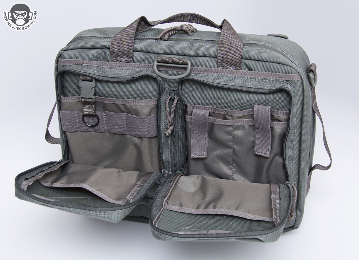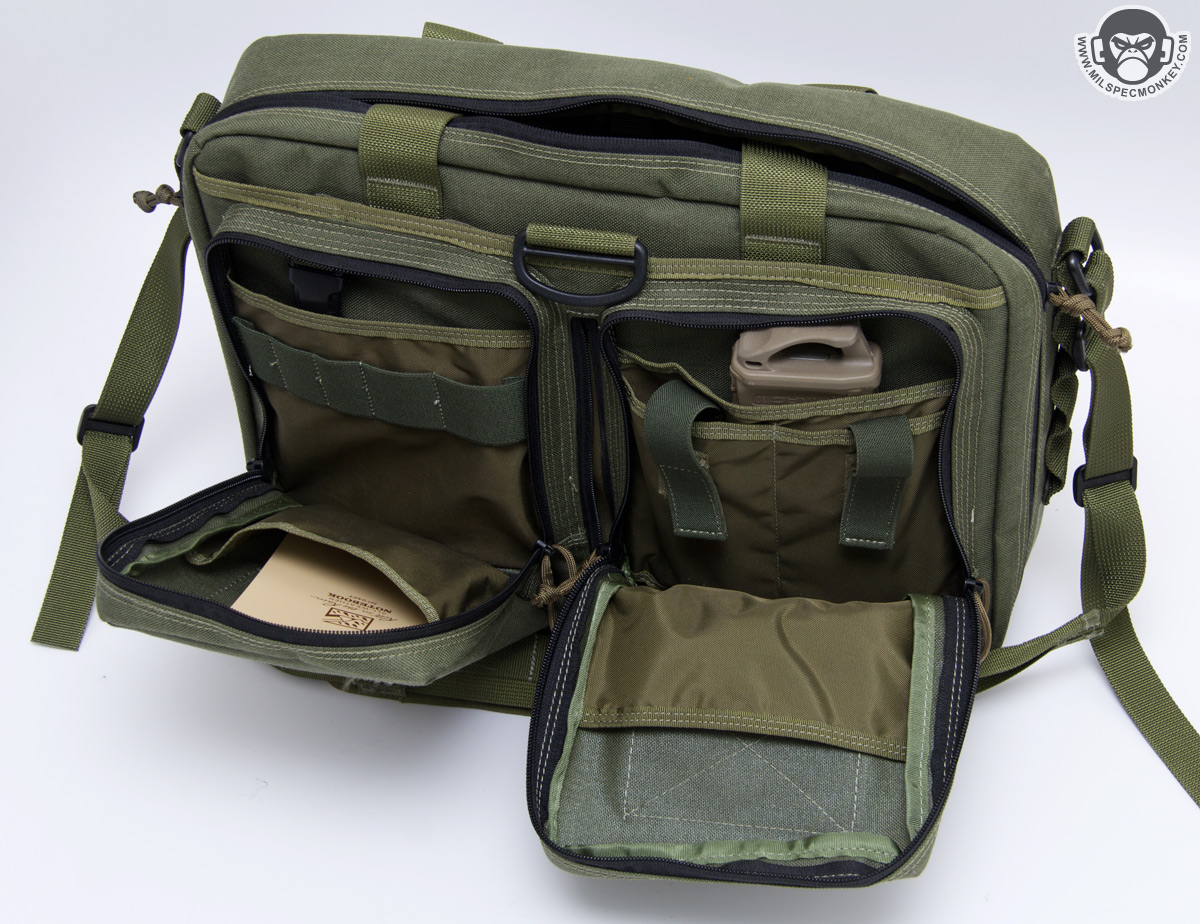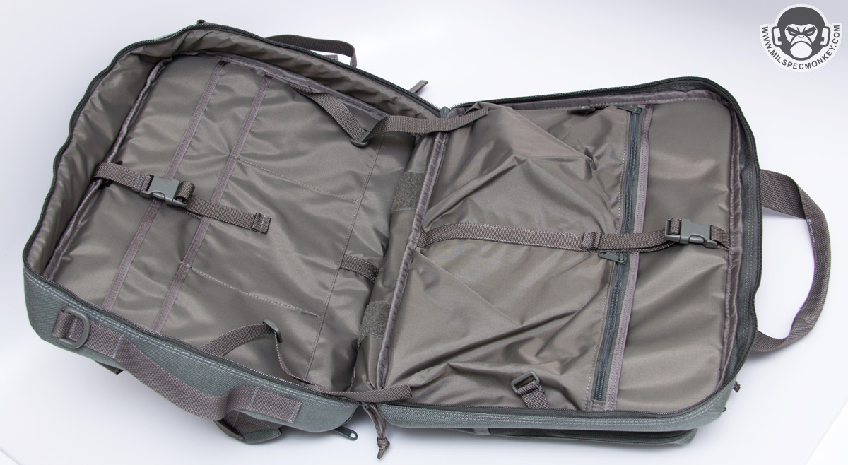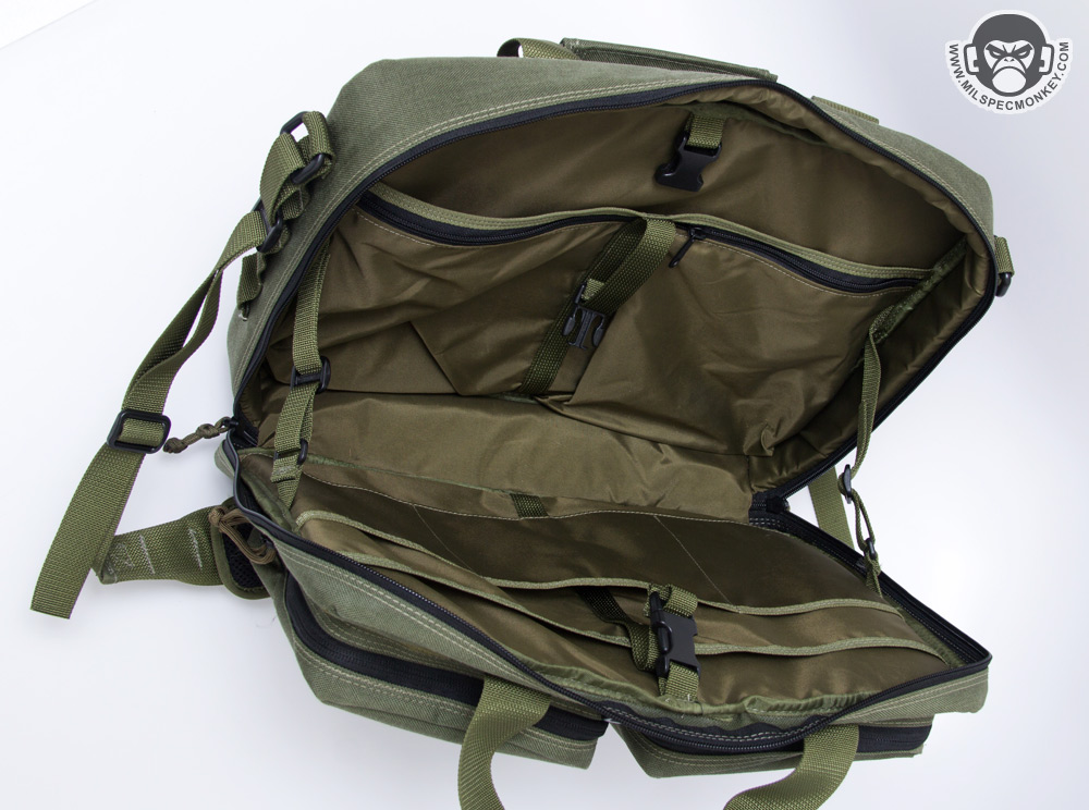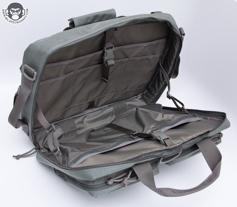 While already on the subject of the main interior I suppose we might as well follow through. As a handy feature, the double zippers open up to a full clam shell style which then can be limited with the adjustable internal webbing as desired. This is nice as most laptop bags don't offer the full opening option while the limit functionality is still there so the bag doesn't accidentally fly open spilling out your goods. The sides are well divided with a tall sleeve pocket being on one side, SRB security strap included, and 3 divided smaller sleeve pockets. The other side offers more options with a slightly shorter main sleeve pocket, SRB security strap, and 2 single zipper billowed pockets to offer more item securing options. This side handles a laptop a little bit easier with the shorter large sleeve pocket. I wish the SRBs were modular / removable as they can come in handy when something needs to be super secured, but also cause insert / extraction hassle when not needed.