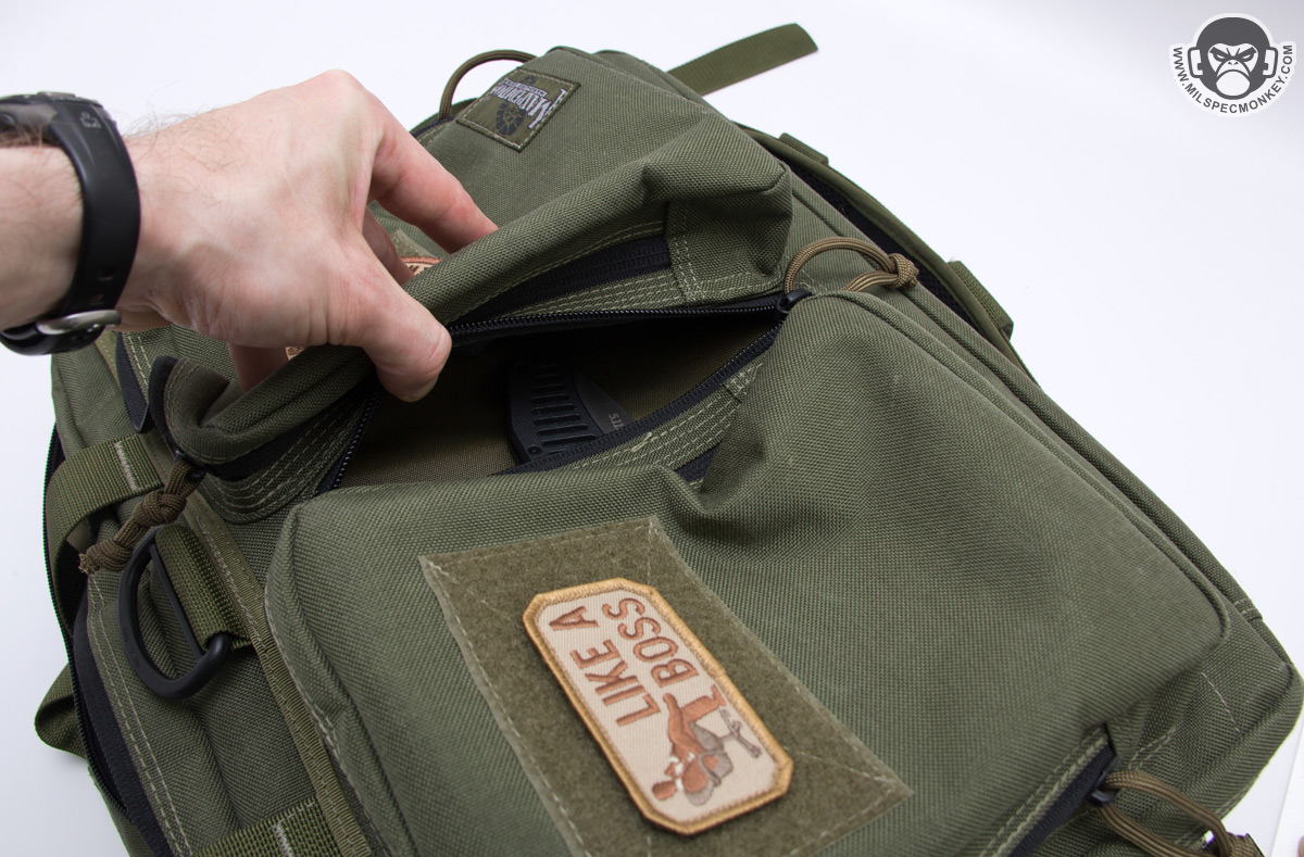 Behind the main frontal pockets is a nice big CCW area that is easy for others to overlook as a pocket and offer another heaping helping of loop velcro space; easily able to hold full sized pistols, magazines, and medium sized flashlights. The opening closes with velcro to prevent accidental interior display with a 2" D-ring incorporated as a pull open point. I have mixed thoughts on the D-ring which Maxpedition has been using for a while. It visually doesn't appear particularly tactical and is likely cost effective, but isn't really that great of a pull since not even all my small monkey fingers can fit inside. Most folks will probably only be able to fit in 2 fingers comfortably so for those who need an easy oh-shit grab I recommended trying out cord or webbing with plastic tubing for rigidity as seen on some pull away pouch designs these days.